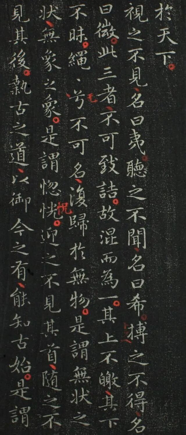 【9】于天下。视之不见名曰夷,听之不闻名曰希,抟之不得名曰微。此三者不可致诘,故混而为一。其上不皦,其下不昧。绳绳不可名,复归于无物,是谓无状之状、无物之象,是谓惚恍。迎之不见其首,随之不见其后。执古之道,以御今之有,能知古始,是谓
