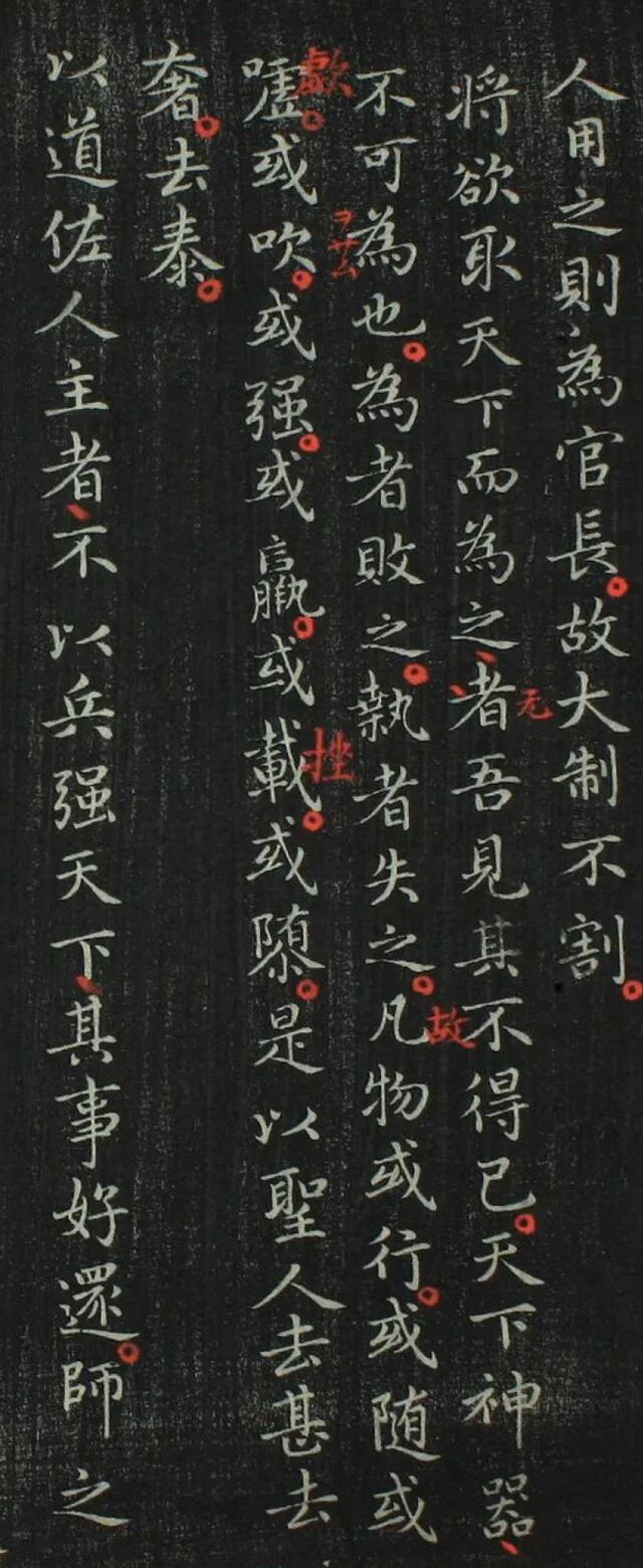 【20】人用之,则为官长,故大制不割。将欲取天下而为之,吾见其不得已。天下神器,不可为也。为者败之,执者失之。故物或行或随;或嘘或吹,或强或羸,或挫或隳。是以圣人去甚,去奢,去泰。以道佐人主者,不以兵强天下。其事好远。师之