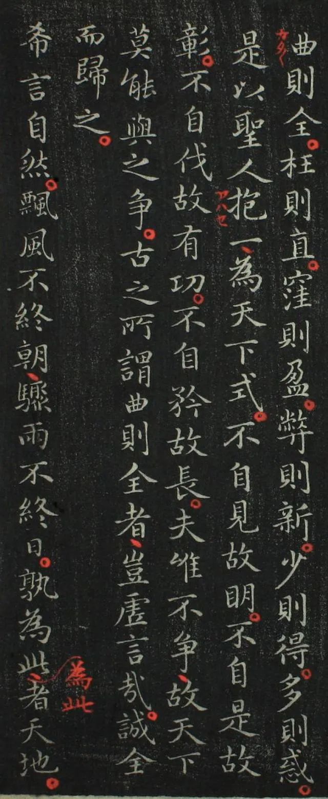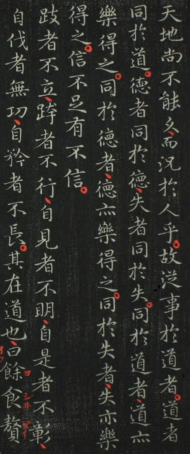 王羲之小楷《道德经》为唐代拓本,现藏于美国哈佛大学图书馆,约纵29厘米,横700厘米,此作如今仅存唐拓本,但亦弥足珍贵。其有着晋人的气质,也有着一定的隶书的古雅意境,字形的笔势有着从容而悠游的法度,这一点是学书之人难以梦到的境界。