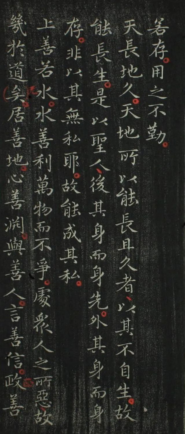 【5】若存,用之不勤。天长地久。天地所以能长且久者,以其不自生,故能长生。是以圣人后其身而身先,外其身而身存。非以其无私邪?故能成其私。上善若水,水善利万物而不争。处众人之所恶,故几于道。居善地,心善渊,与善仁,言善信,政善