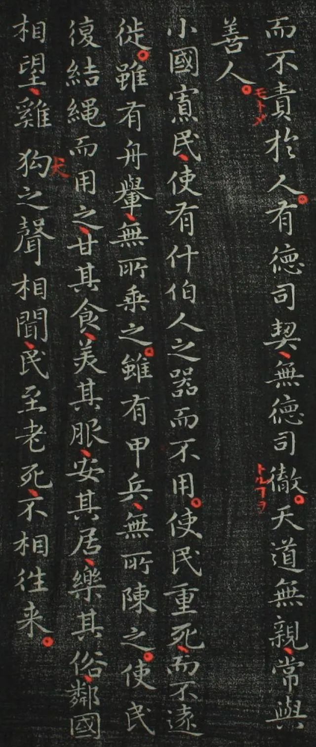 【53】而不责于人。有德司契,无德司彻。夫天道无亲,常与善人。小国寡民。使有什伯之器而不用;使民重死而不远徙;虽有舟舆,无所乘之,虽有甲兵,无所陈之;使民复结绳而用之。甘其食,美其服,安其居,乐其俗。邻国相望,鸡犬之声相闻,民至老死,不相往来。