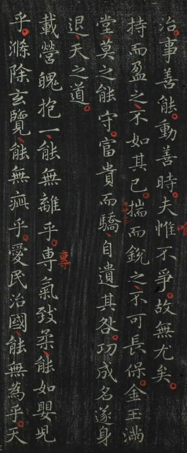 【6】治,事善能,动善时。夫唯不争,故无尤。持而盈之,不如其已。揣而锐之,不可常保。金玉满堂,莫之能守;富贵而骄,自遗其咎。功遂身退,天之道也。载营魄抱一,能无离乎?专气致柔,能如婴儿乎?涤除玄览,能无疵乎?爱民治国,能无为乎?天