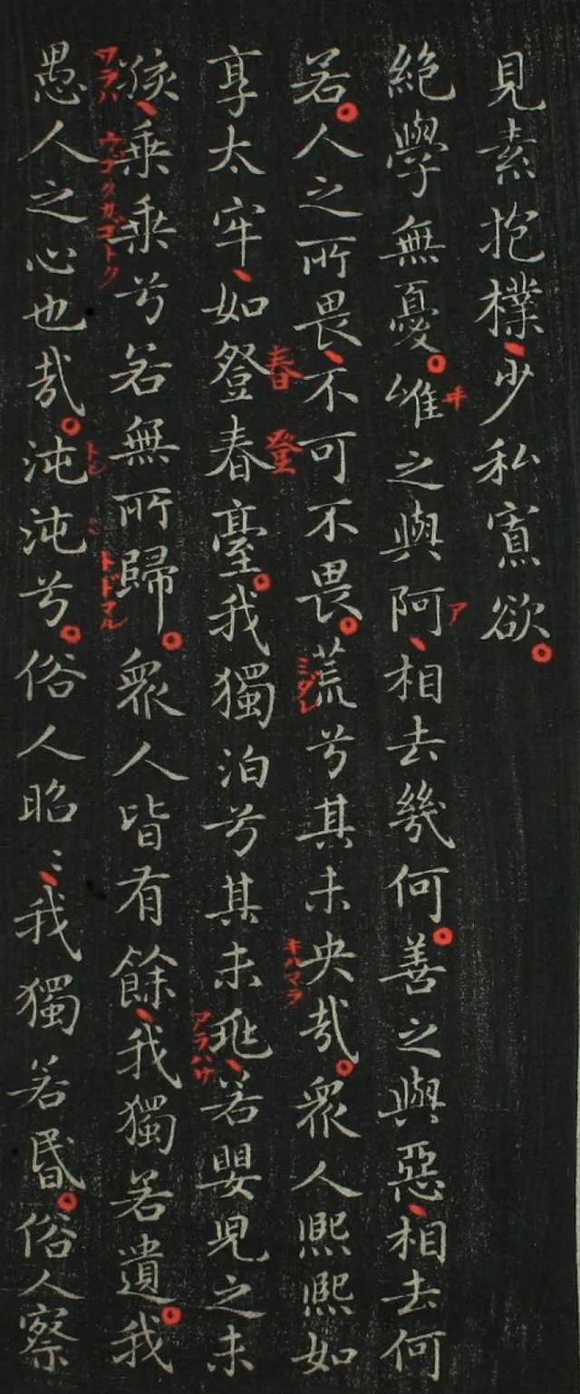 【13】见素抱朴,少私寡欲。绝学无忧。唯之与阿,相去几何?善之与恶,相去何若?人之所畏,不可不畏。荒兮,其未央哉!众人熙熙,如享太牢,如春登台。我独泊兮,其未兆,如婴儿之未孩;傫傫兮,若无所归!众人皆有余,而我独若遗。我愚人之心也哉!沌沌兮!俗人昭昭,我独昏昏;俗人察