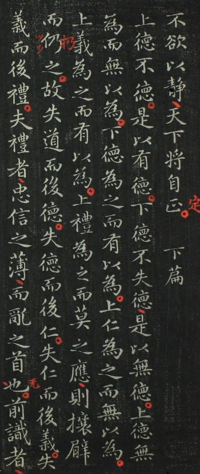 【26】不欲以静,天下将自定。上德不德,是以有德;下德不失德,是以无德。上德无为而无以为,下德为之而有以为。上仁为之而无以为,上义为之而有以为,上礼为之而莫之应,则攘臂而扔之。故失道而后德,失德而后仁,失仁而后义,失义而后礼。夫礼者,忠信之薄而乱之首。前识者,
