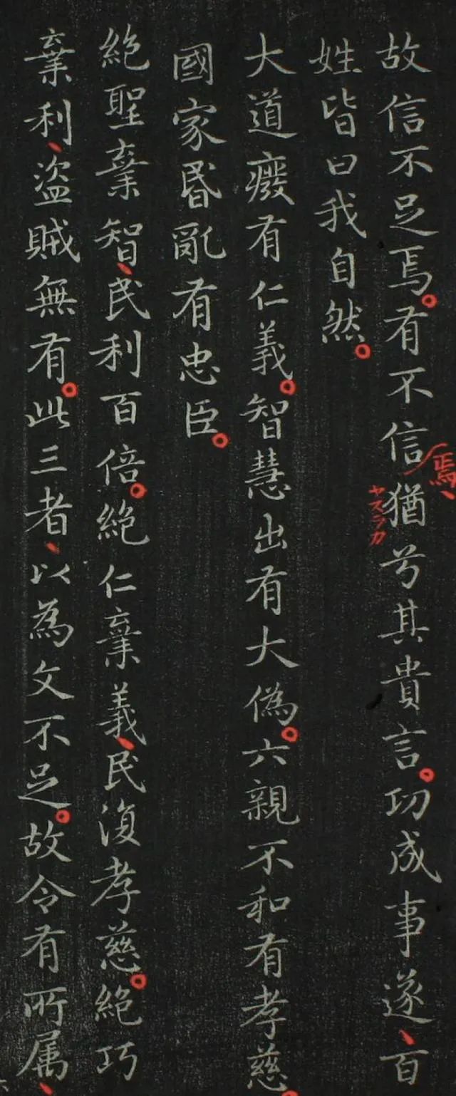 【12】故信不足焉,有不信焉。悠兮其贵言。功成事遂,百姓皆谓我自然。大道废,有仁义,智慧出,有大伪,六亲不和,有孝慈,国家昏乱,有忠臣。绝圣弃智,民利百倍,绝仁弃义,民复孝慈,绝巧弃利,盗贼无有。此三者以为文不足,故令有所属,