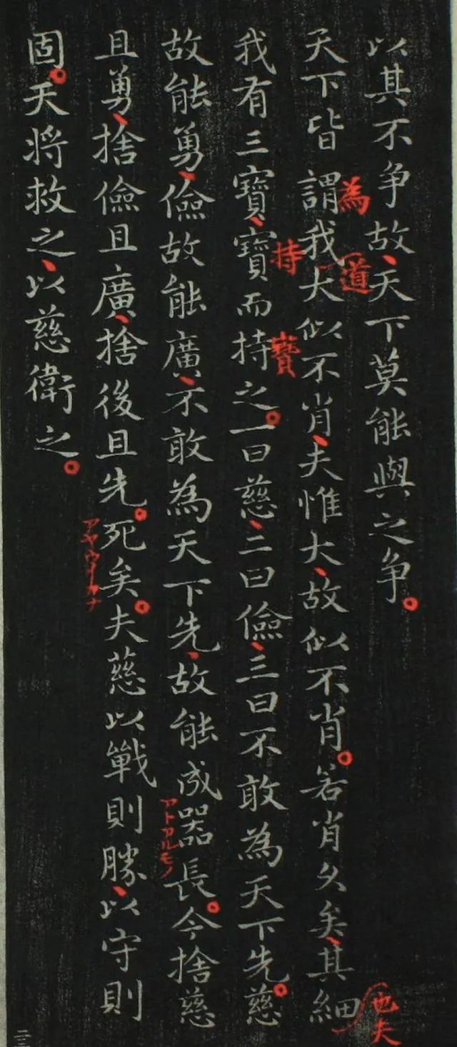 【46】以其不争,故天下莫能与之争。天下皆谓我道大,大而不肖。夫唯不肖,故能大。若肖,久矣其细也夫!我恒有三宝,持而宝之。一曰慈,二曰俭,三曰不敢为天下先。慈故能勇;俭故能广;不敢为天下先,故能成器长。今舍慈且勇;舍俭且广;舍其后且先;则死矣。夫慈,以战则胜,以守则固。天将建之,以慈垣之。