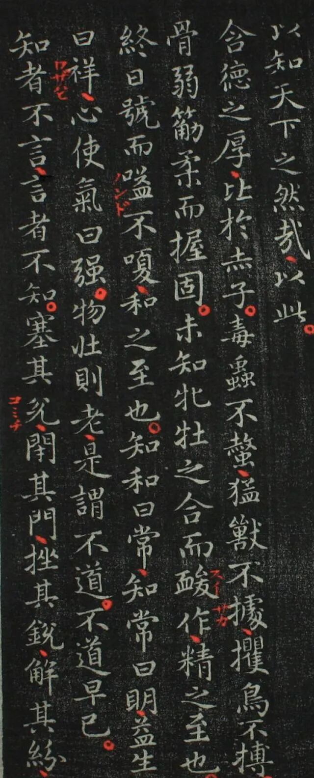 【37】以知天下然哉?以此。含德之厚,比于赤子。蜂虿虺蛇不螫,攫鸟猛兽不搏。骨弱筋柔而握固。未知牝牡之合而朘作,精之至也。终日号而不嗄,和之至也。和曰常,知常曰明。益生曰祥。心使气曰强。物壮则老,谓之不道,不道早已。知者不言,言者不知。塞其兑,闭其门,挫其锐,解其纷,