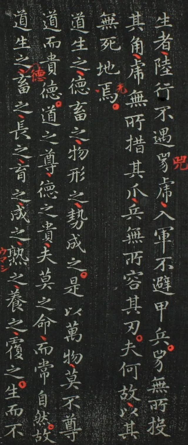 【34】生者,陆行不避兕虎,入军不被甲兵;兕无所投其角,虎无所用其爪,兵无所容其刃。夫何故?以其无死地焉。道生之,德畜之,物形之,器成之。是以万物莫不尊道而贵德。道之尊,德之贵,夫莫之爵而常自然。故道生之,德畜之;长之育之,亭之毒之,养之覆之。生而不