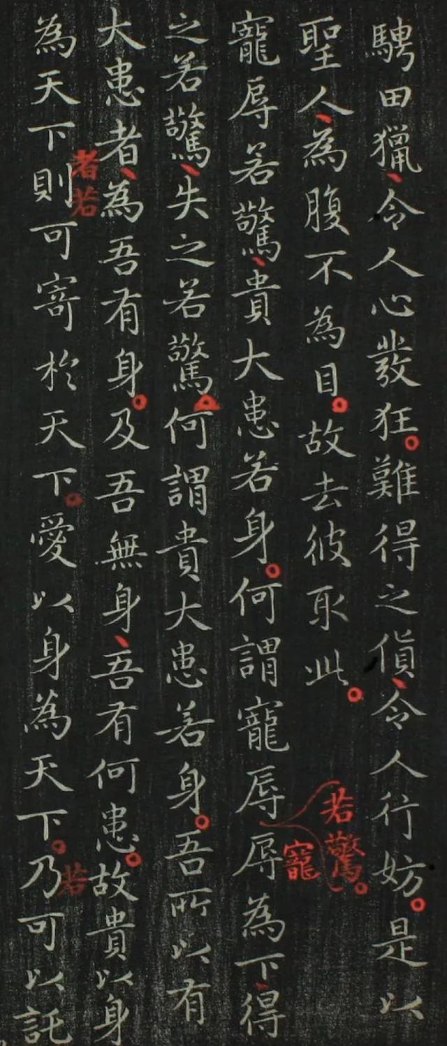 【8】骋畋猎令人心发狂,难得之货令人行妨。是以圣人为腹不为目,故去彼取此。宠辱若惊,贵大患若身。何谓宠辱若惊?宠为下。得之若惊,失之若惊,是谓宠辱若惊。何谓贵大患若身?吾所以有大患者,为吾有身。及吾无身,吾有何患?故贵以身为天下,若可寄于天下,爱以身为天下者,若可托