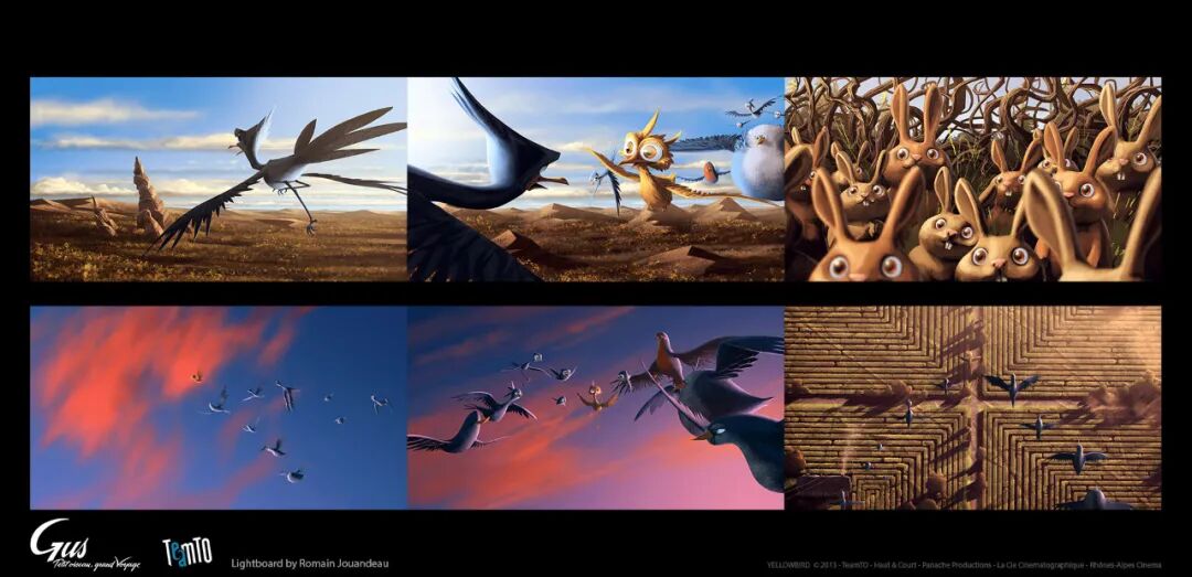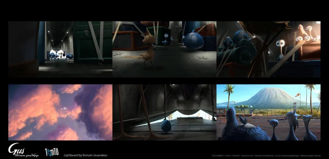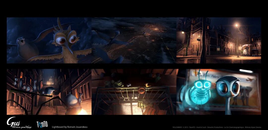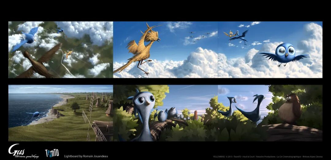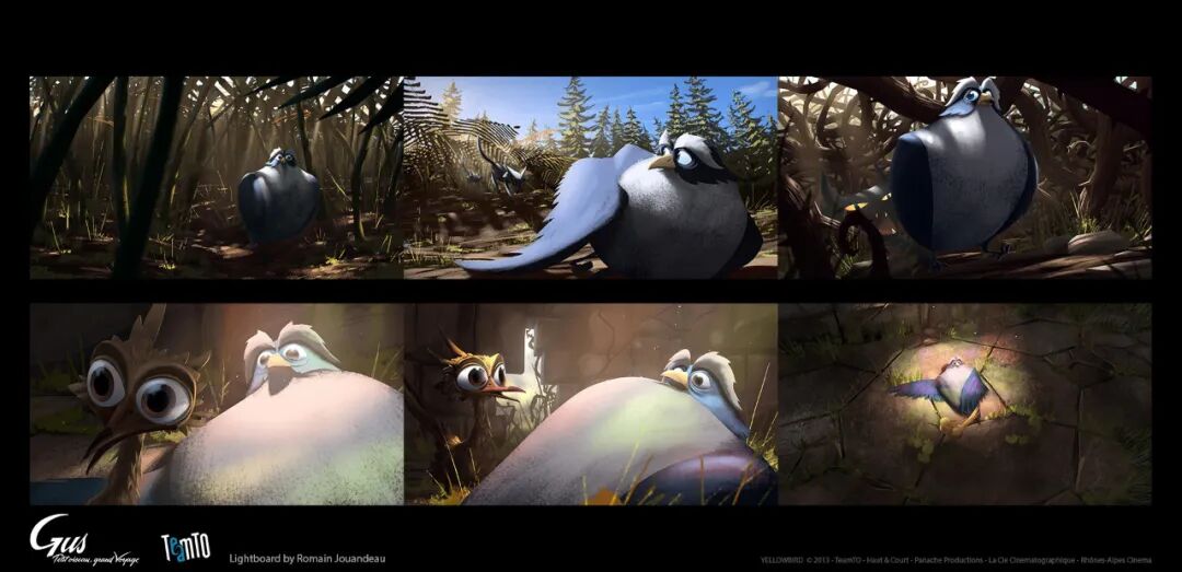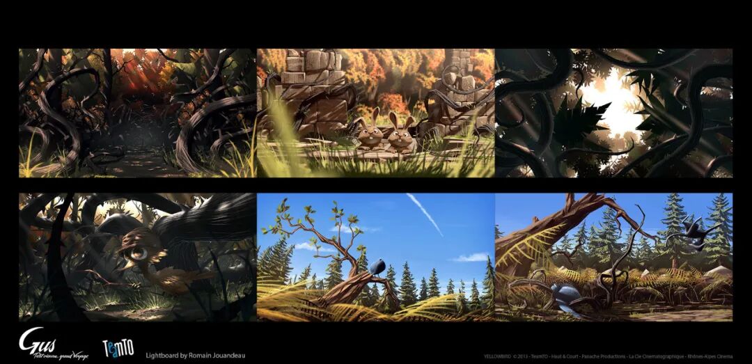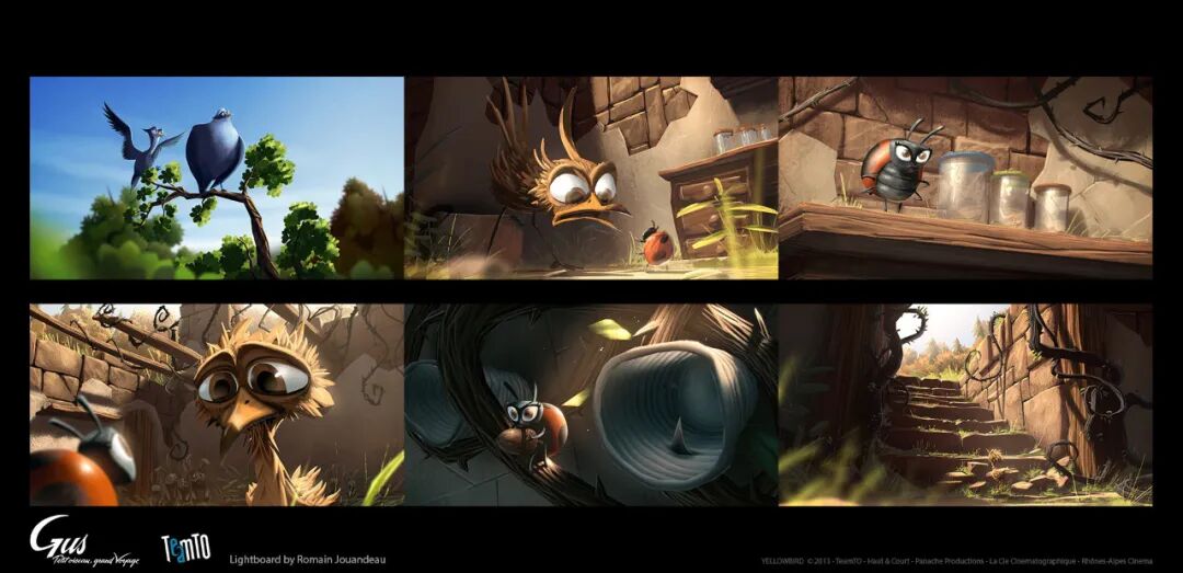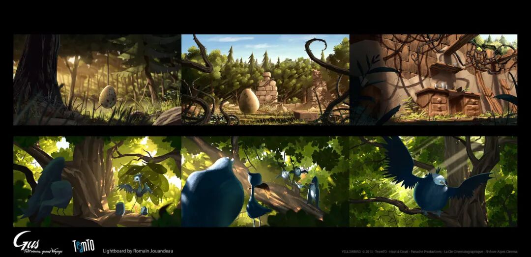 除了以上CG场景概念图,2018年,R神在法国TeamTO动画公司推出的动画电影《飞鸟历险记》的概念设计中,也呈现出了自己极为高水准的分镜能力,流畅的叙事搭配十分风格化的光影和色彩,每一帧故事性都极强!