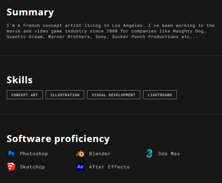 来自法国的高级场景概念艺术家,现居美国西雅图。曾在Quantic Dream、Warner Brothers、Sony Sucker Punch Productions等公司工作,曾参与游戏《对马岛之魂》、《底特律:变人》等项目的场景概念设计。