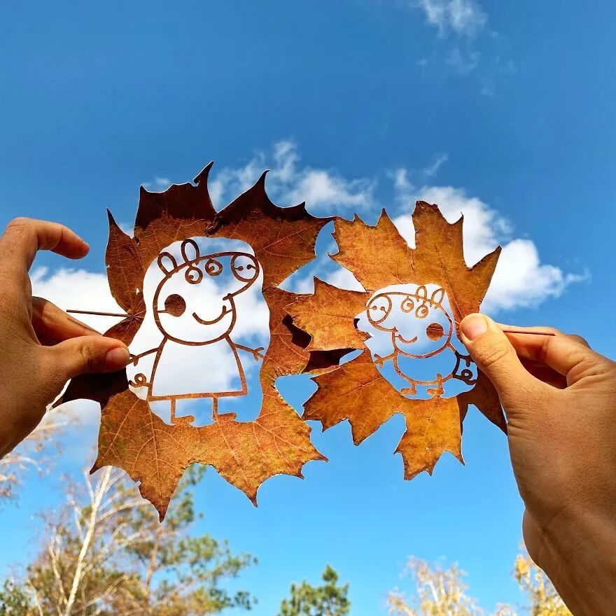 在尝试过用树叶去创作后,这位艺术家就喜欢上了树叶,并利用切割刀具在树叶上刻制出许多有趣的图案,制作这种树叶作品并不算轻松,对于一位没有绘画经验的人更是难上加难,为了提升自己的技能,他在最初的一段时间,每一天只睡3到4个小时,剩下的时间全都用来制作树叶作品,经过长期的努力,让他的作品被迪士尼所采纳。