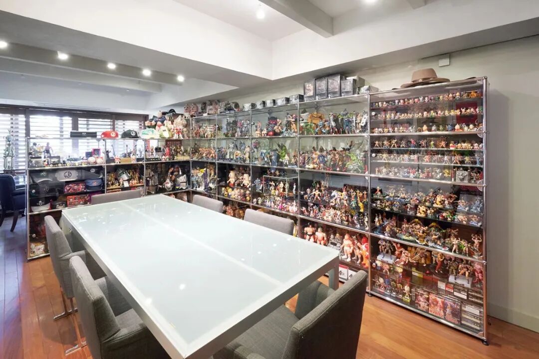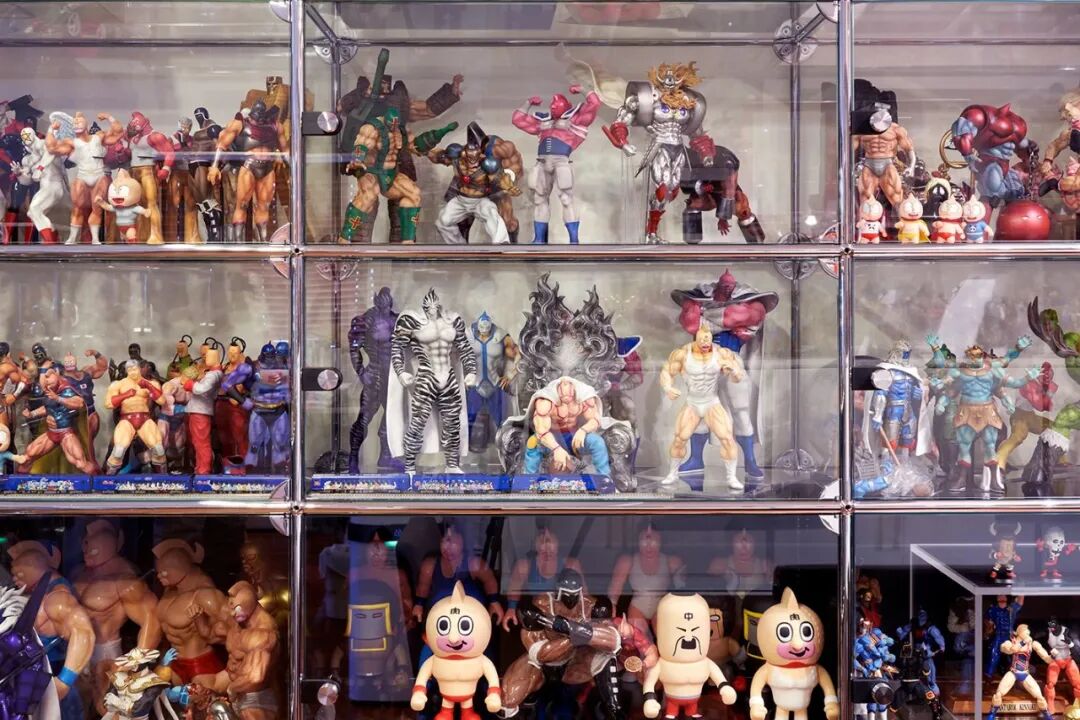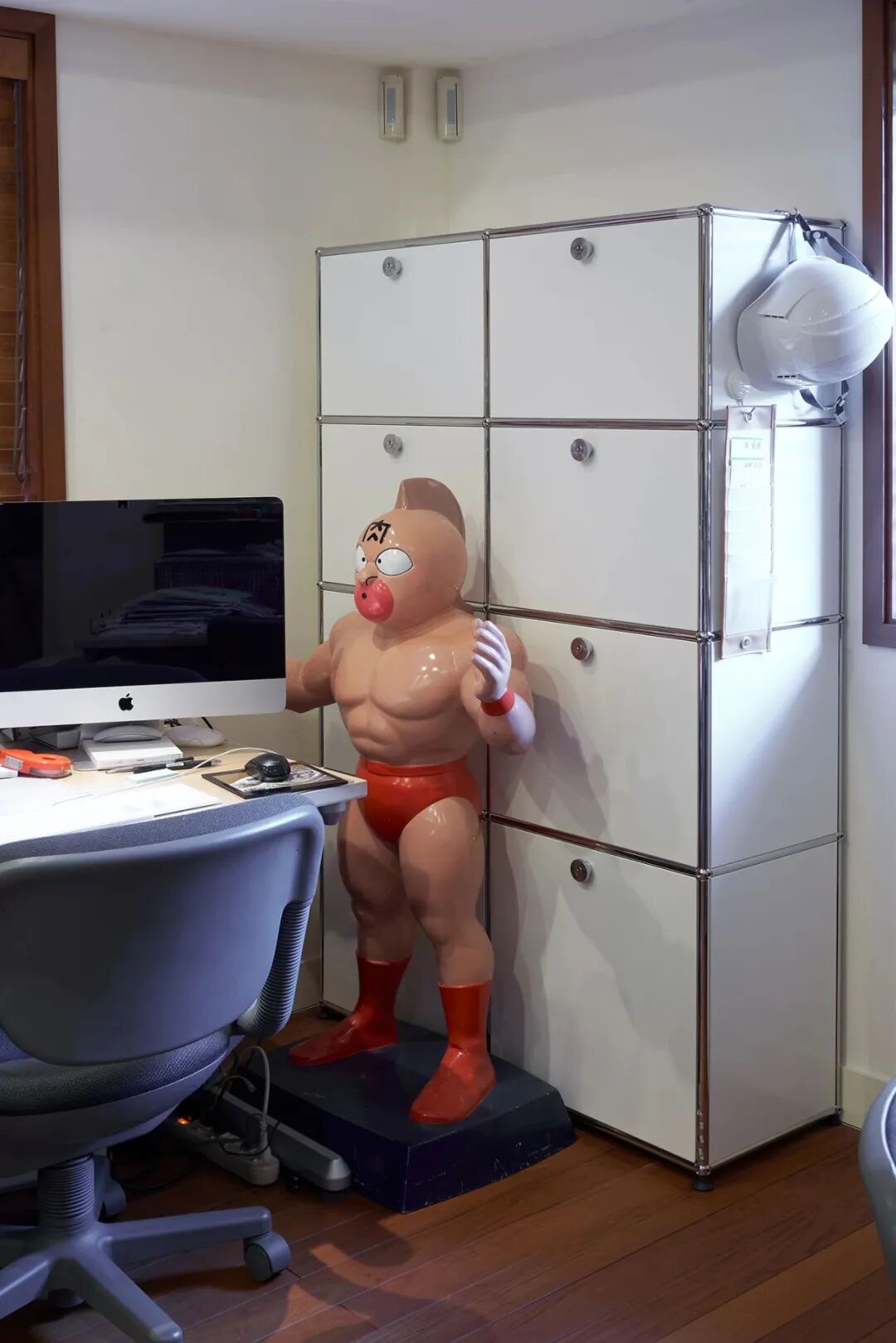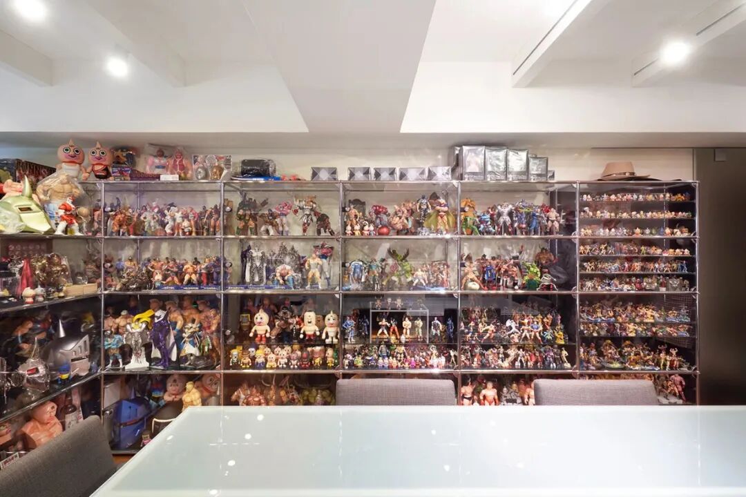 他最知名的漫画当属1979年被《周刊少年Jump》连载的《金肉人》(Kinnikuman),而柜子里展示的就是漫画里的数百个超人角色。收藏的十年间,USM Haller收纳柜已经扩张过两次,纤细的不锈钢边框与玻璃门搭配,形成整洁无暇的空间,方便搭建与搬运。