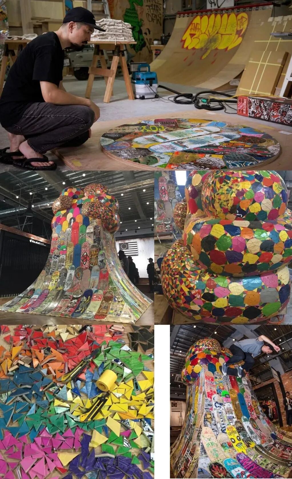 让人惊讶的是他的作品并不是借助先进的计算机建模来实现的,而是全部用原始的大脑视觉反射来完成的。简单来说,就是一堆废旧滑板(自他成名以后,废旧滑板就不再是一个需要收集的项目,来自全球各地的爱好者源源不断地为他提供材料)在Haroshi的注视下被分类,剪辑,粘贴,加工……“因为我不会用Photoshop”,Haroshi对此解释道,这大概能解释为何他的作品能连年升值,被炒到几十万的价格。