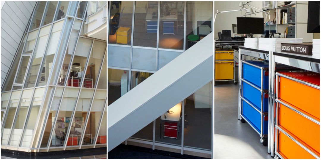 而本文的主角也出现在这张图里,就是左边靠墙摆放的白色的混合着不锈钢与玻璃、如同建筑设计一般外观的储物柜,来自瑞士的USM模块化家具。