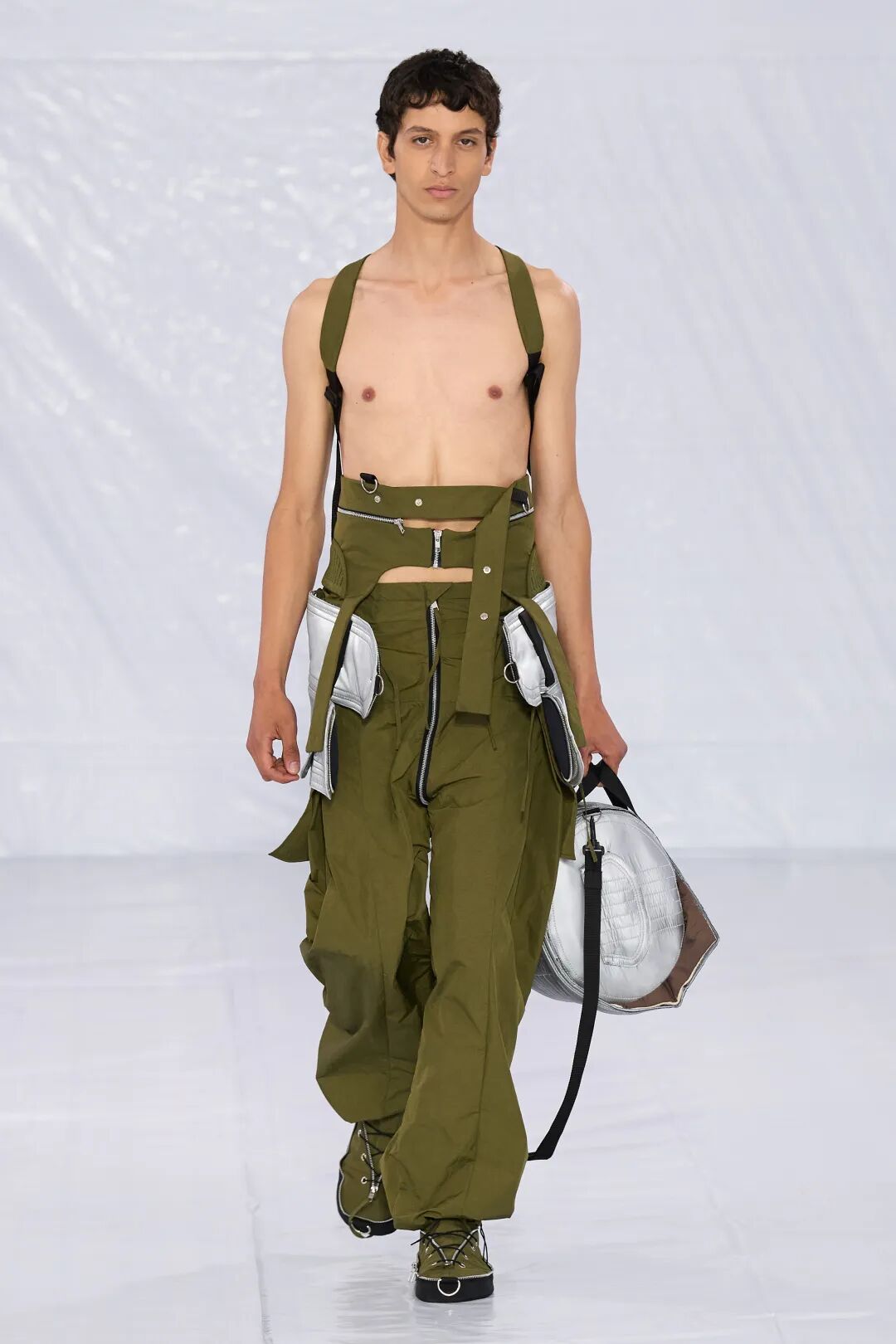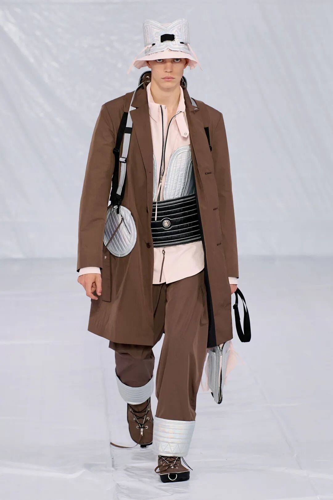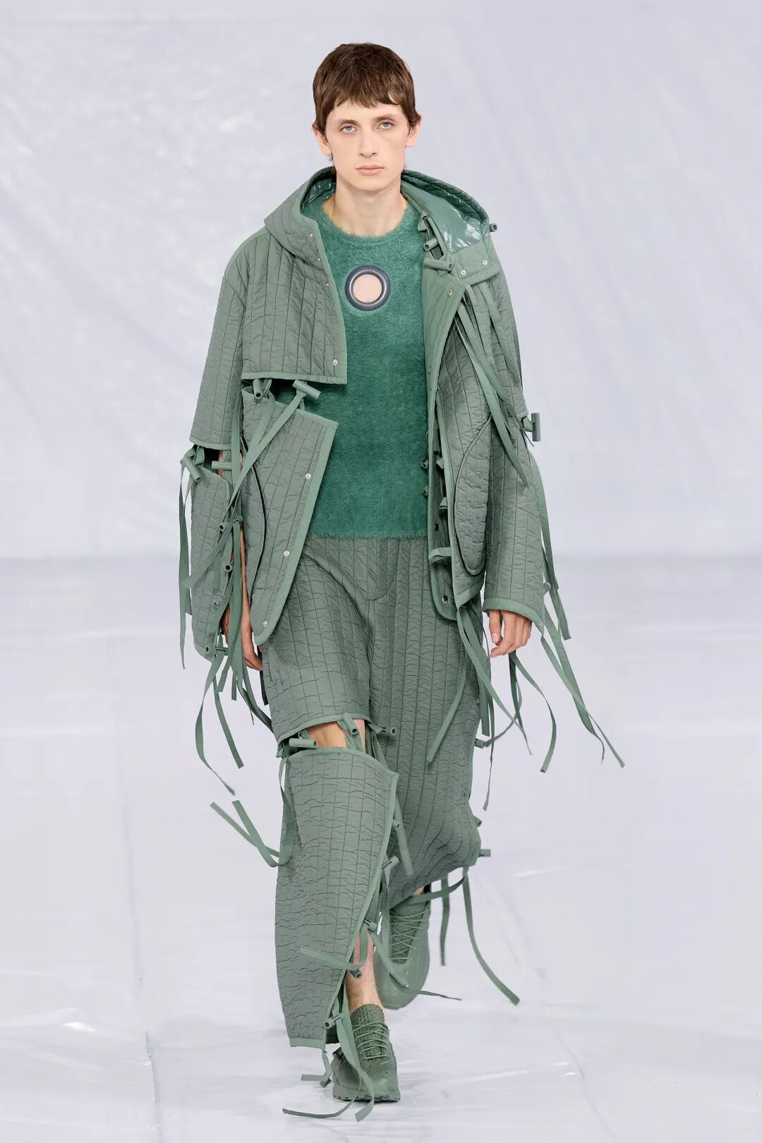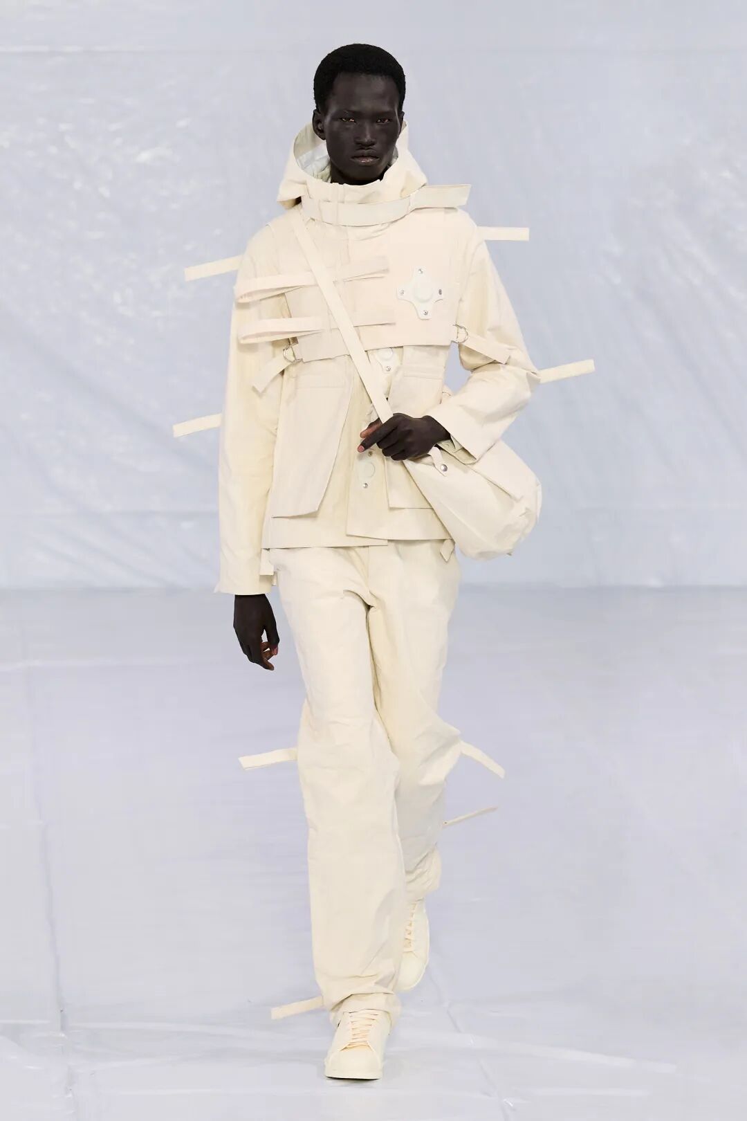 Craig Green将旅程的线性叙事经过整合,注入到设计中。在这里男子气概被质疑、解构、重新演绎,那带有分解性的手工配饰经过重新排练组合,好像军旅的设备让人想到了创伤与破碎。