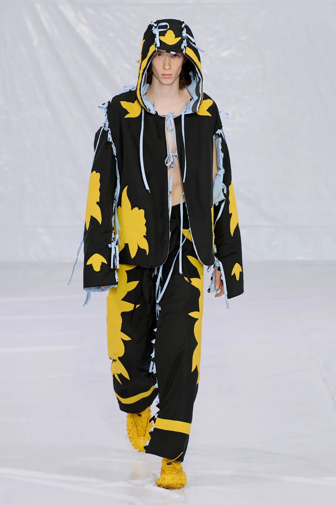 Craig Green的服装总是充满诱惑力,结构主义的帐篷支撑的一个空间,或是超现实主义的木头与织物交叉拼接的“遮蔽处”,又或者是固化扎染创作出的“一块画布”,你总能被奇奇怪怪的脑洞吸引。