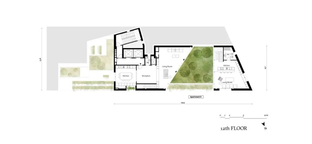 公寓共有13层,住宅有普通公寓和豪华公寓。底层包含酒吧、咖啡馆和画廊功能区。地下设有一个停车场。