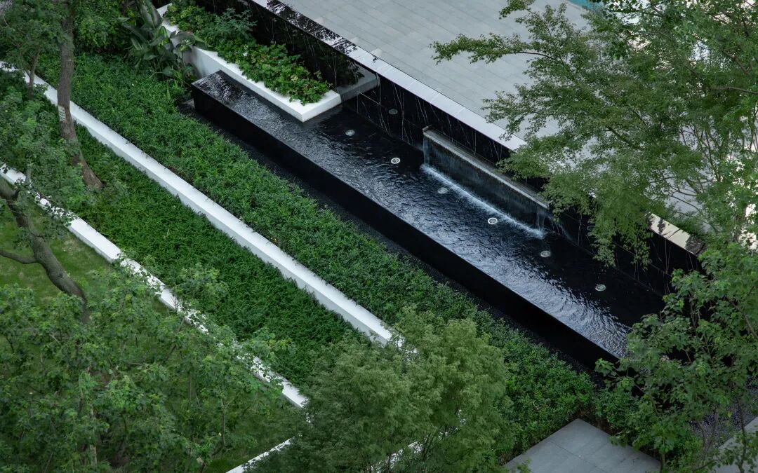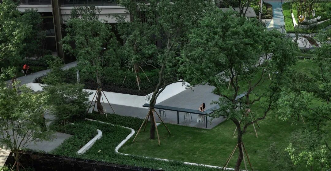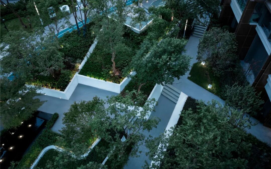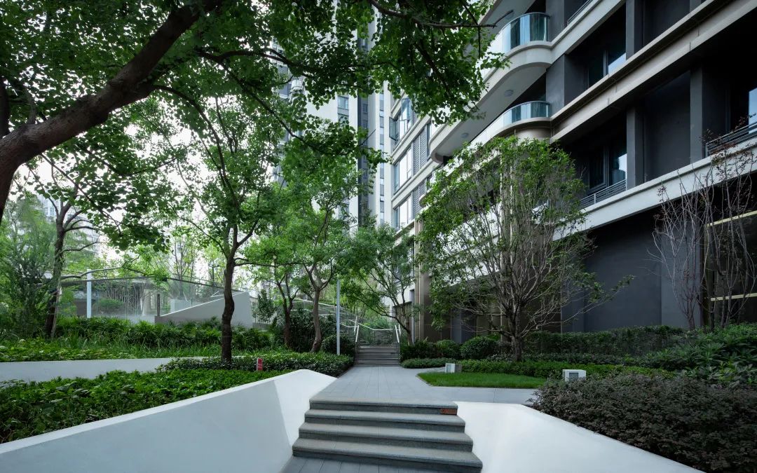 阳光划过林间,光斑穿透着景墙,仿佛时间静止,或者物我两忘。通过大量植被与其它景观相隔,方便居者独处、安静放松,愈发感受结庐在人境的意蕴。