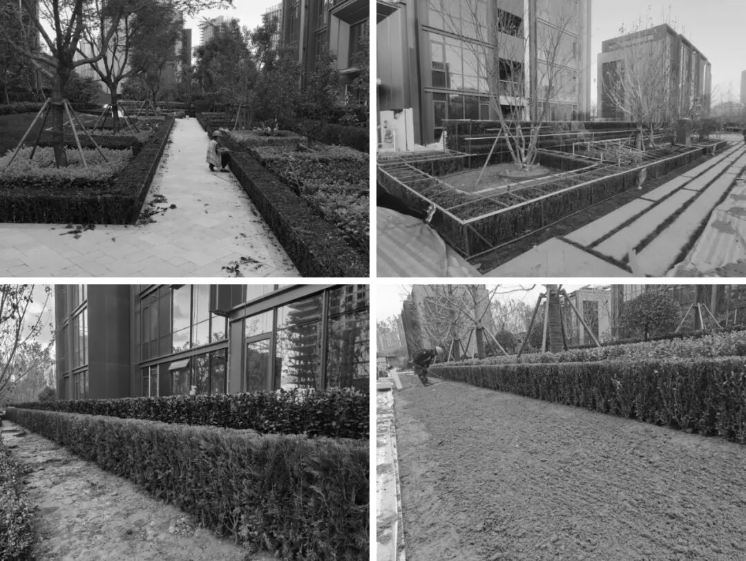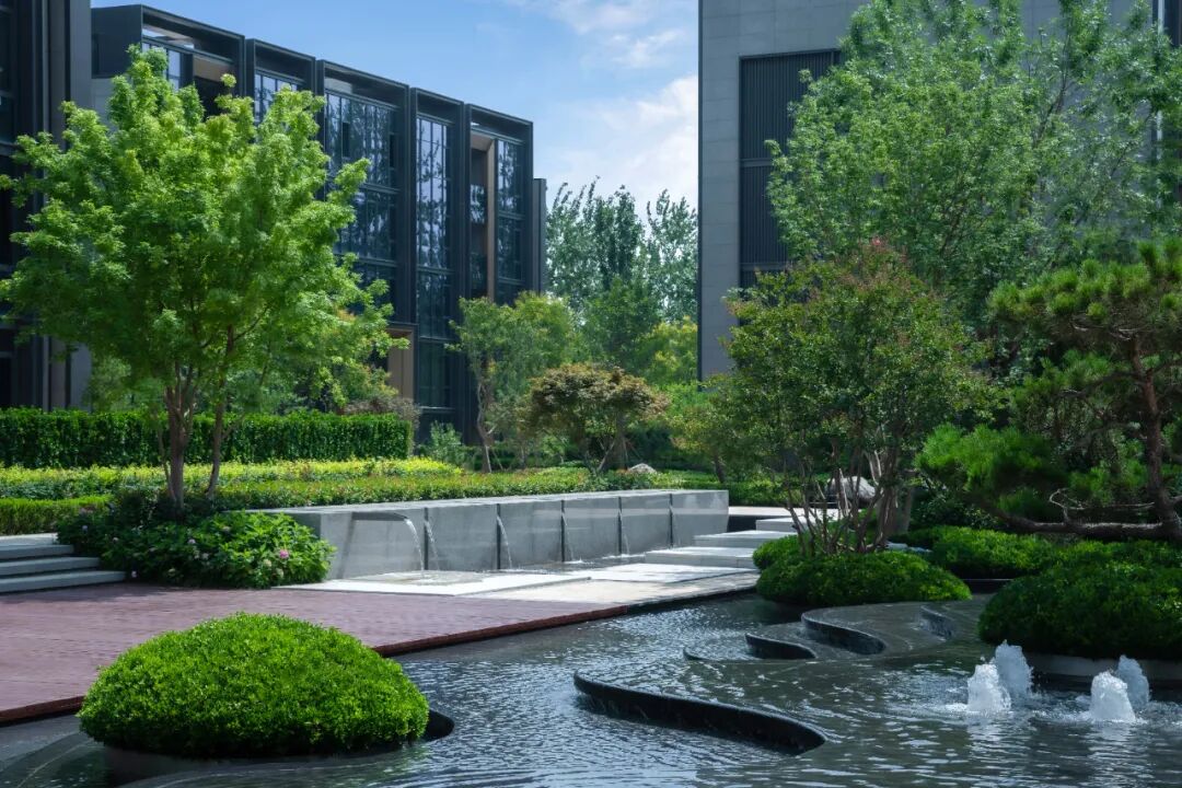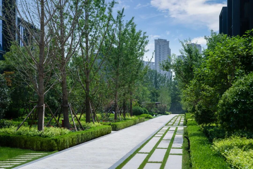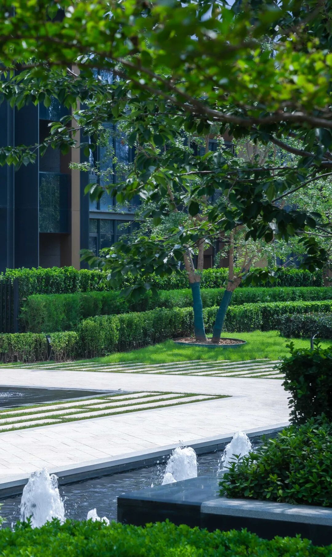 植物设计打造立体层次艺术,园内多选用高大乔木,加强绿植体系的框架感,通过对乔木的高低、冠幅等反复梳理、推敲,确保其在水平与竖直方向上都能获得充分的条理。下端再以小乔木、灌木、时花、地被进行点缀,将丰富的绿带空间引入园区,回归自然之所。