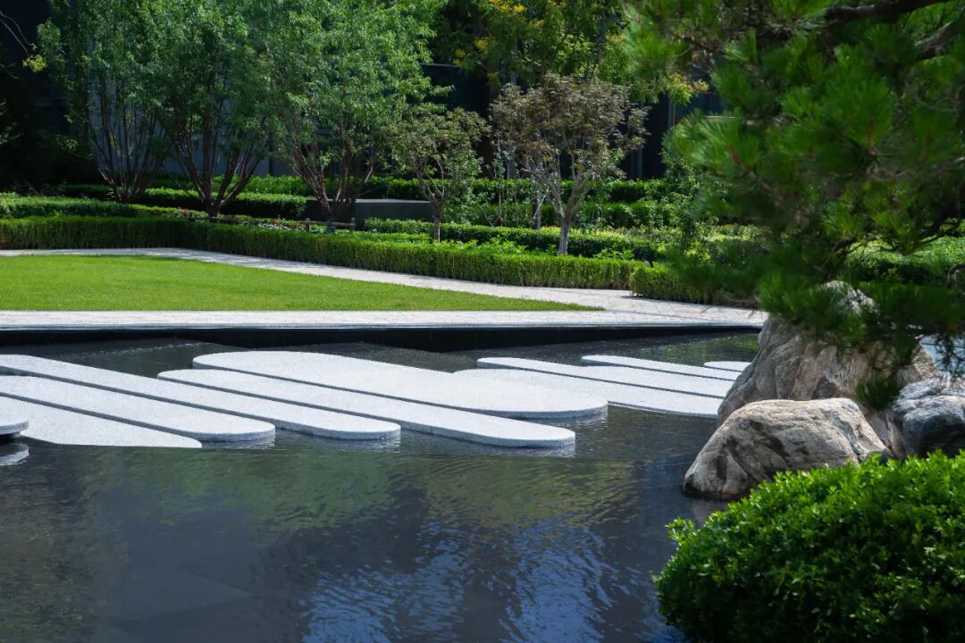 白色汀步置于水景之上,使人们便于蹑步而行,为园区增加了灵活性与互动性,同时通过与水景色彩一深一浅的对比冲击感,提升园区的视觉美学,焕新园区界面。