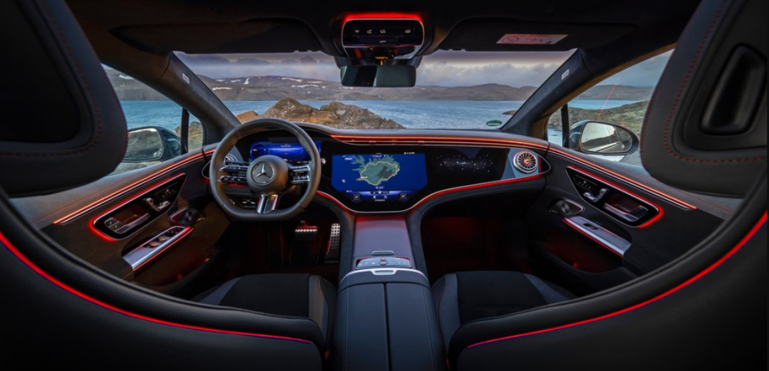 比如摆脱了发动机的局限,两款车都用上了“弓形车身”,车头最大程度地向下延伸,与奔驰的油车好似两个世代。