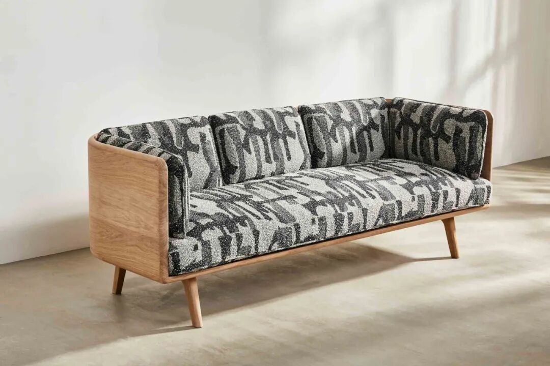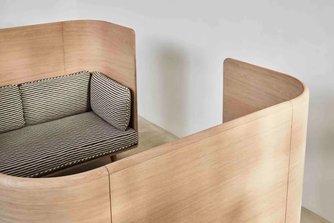 沙发弯曲的木材框架环绕着织物座椅,简约的设计强调了木的自然纹理。