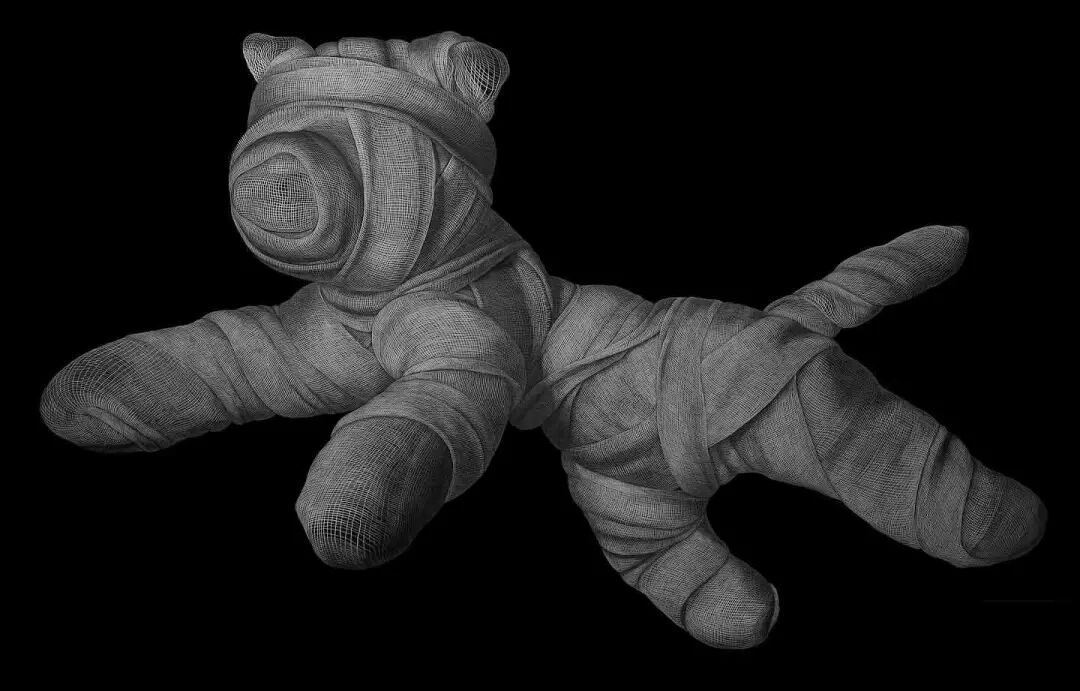 Adeel Uz Zafar用纱布和绷带包裹并隐藏儿童的毛绒玩具,然后在乙烯基塑料(巴基斯坦的一种家用材料)上重新制作它们。他巧妙融合我们对童年愉快和不愉快的各种回忆,反映了当下儿童纯真的丧失。