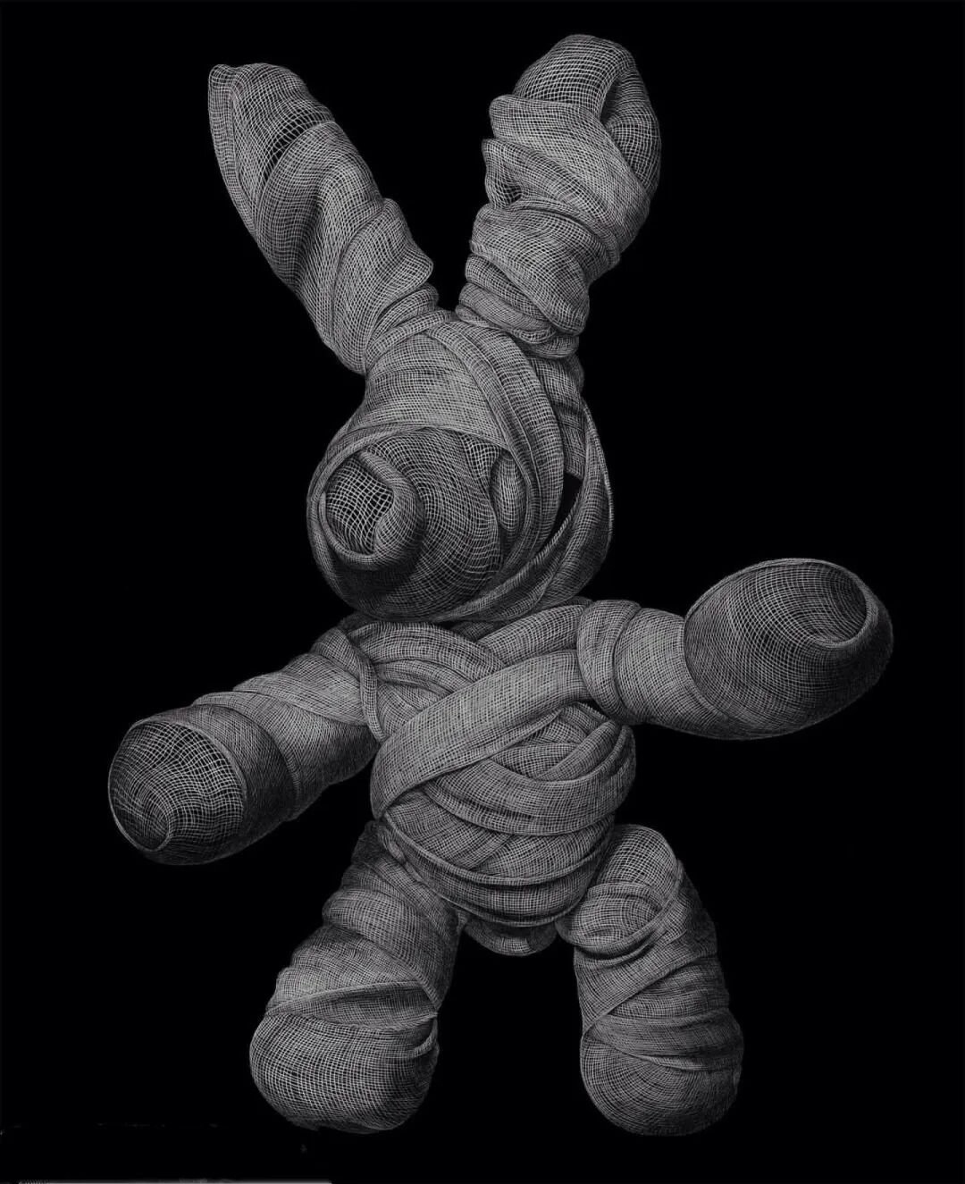 他说:“儿童玩具的主题用绷带包裹着,我的技术是逐行刮掉黑色乳胶表面,以产生精心渲染的看似三维的形式。由此产生的人物形象,与一片漆黑的广阔天地相映生辉,同时令人难以忘怀,并充满了孤独感。”