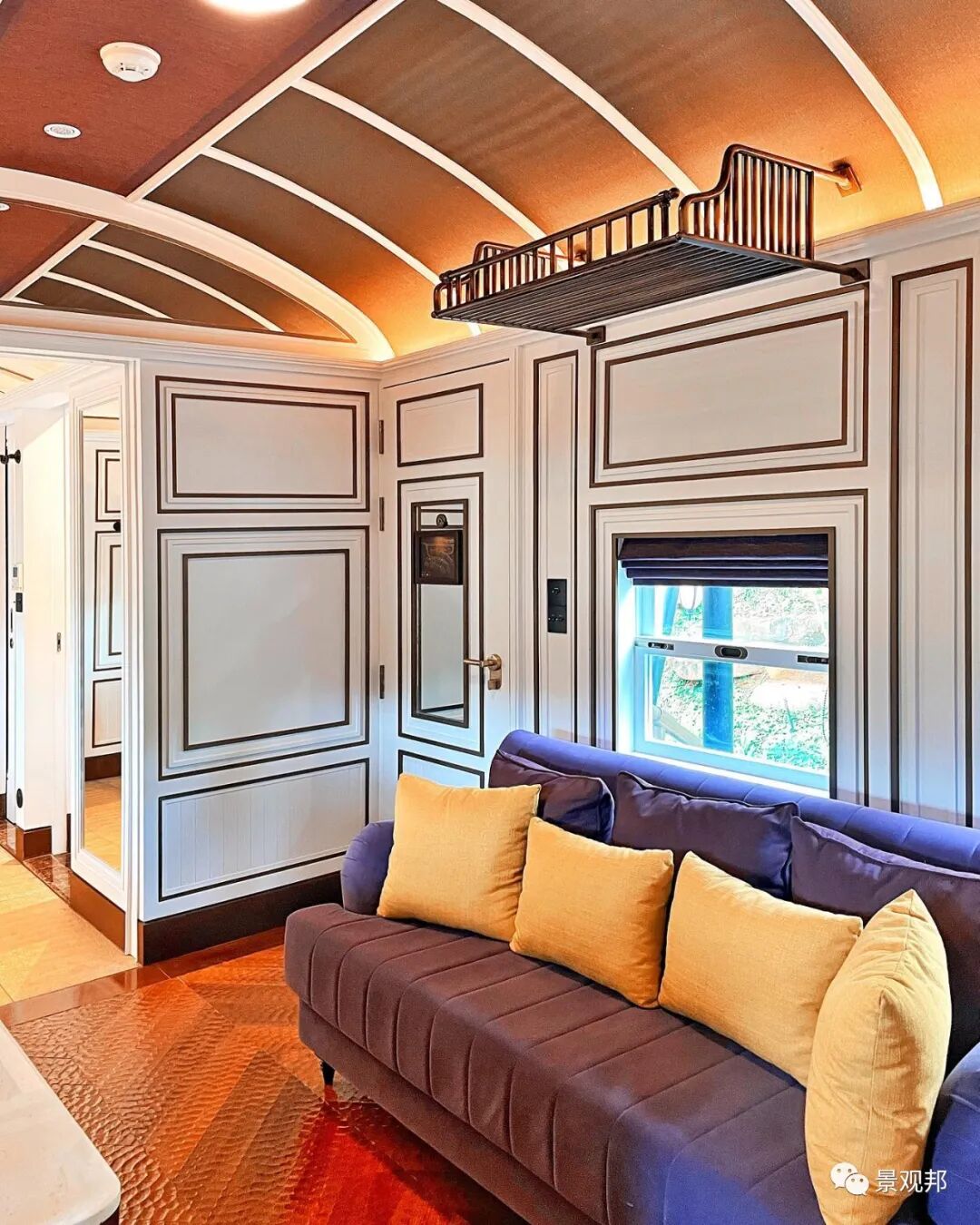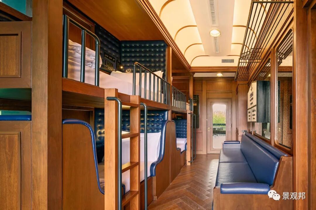 并且车厢内还依旧保留着那个年代火车旅行会看到的东西,比如车站站牌、古董行李架和上下铺等。火车套房面积虽然不大,但氛围感却极强。