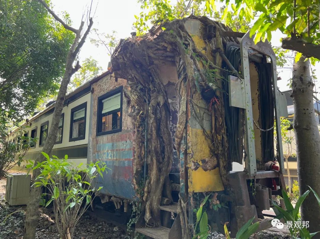“废弃火车车厢在泰国随处可见,它们有些已经在田野里呆了 50多年,就像吴哥窟一样,榕树在车顶生根发芽,几乎完全包住了车厢。虽然我们不得不移除大部分树木以将火车挪出田野,但也保留了一部分巨大的根系,因为回归地球母亲的想法一样具有美感。”Bensley说道。