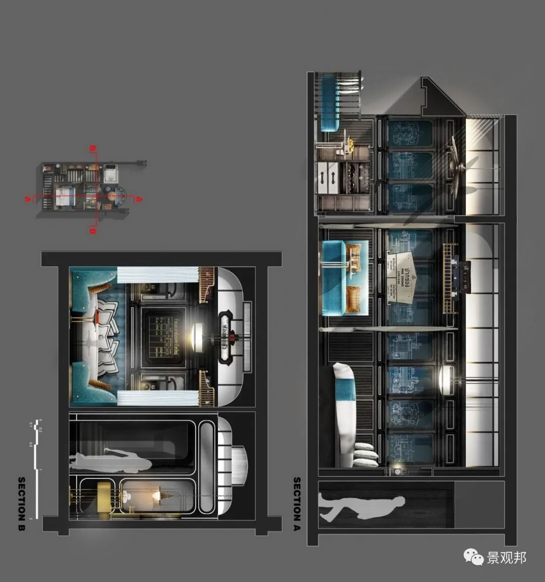 每间客房均设有弧形天花板和壁挂式行李架,客房两侧设有错视画窗,上面画着手绘的热带风景。