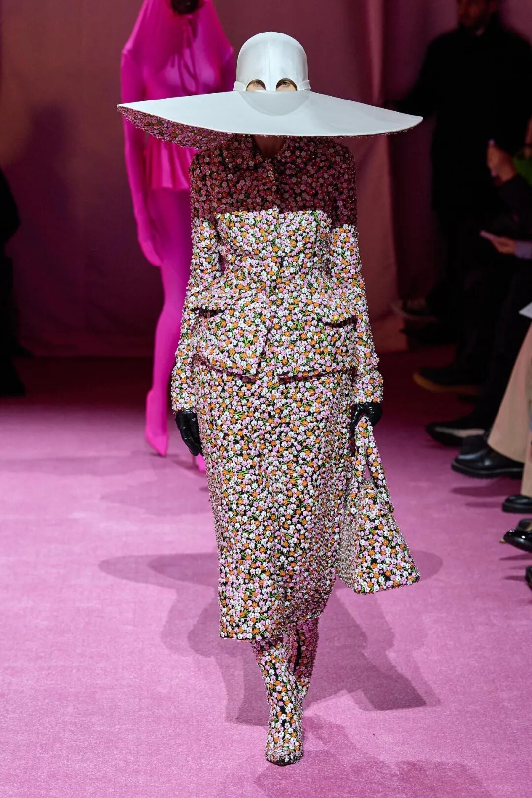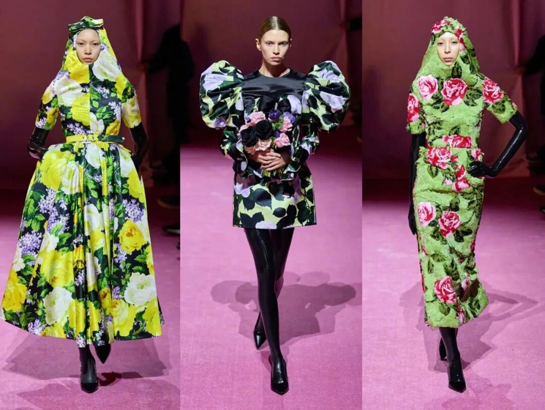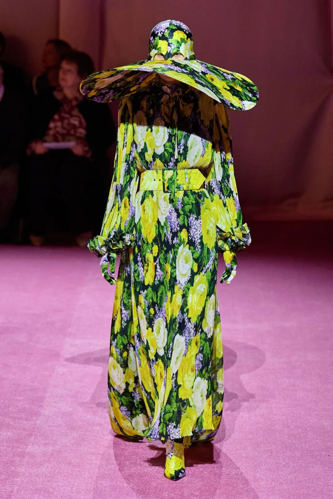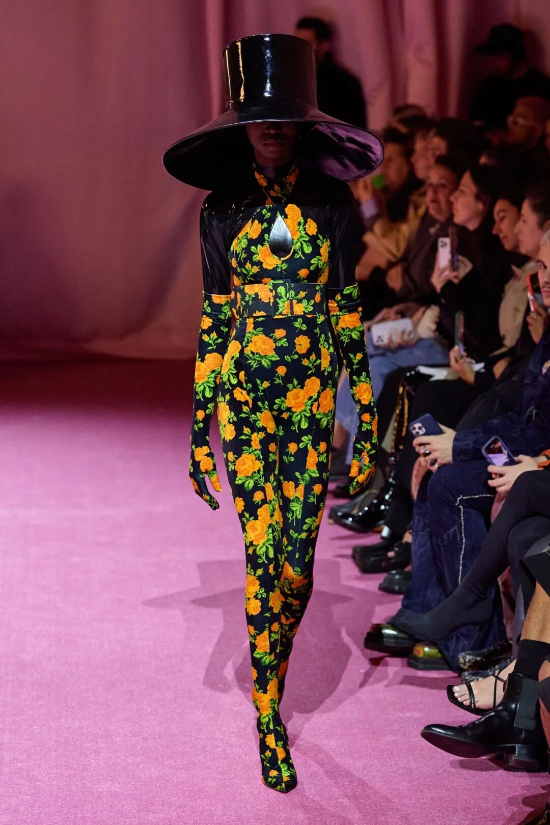 超大号的宽边帽吸引了在场所有人的注意力,成为了系列的点睛之笔。熟悉的蓝色黄色灰色玫瑰印花出现在不同款式上,令人目不暇接。