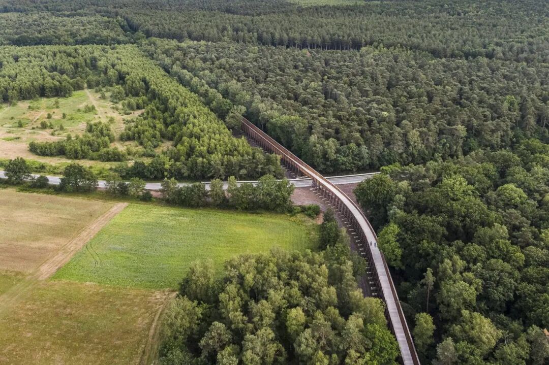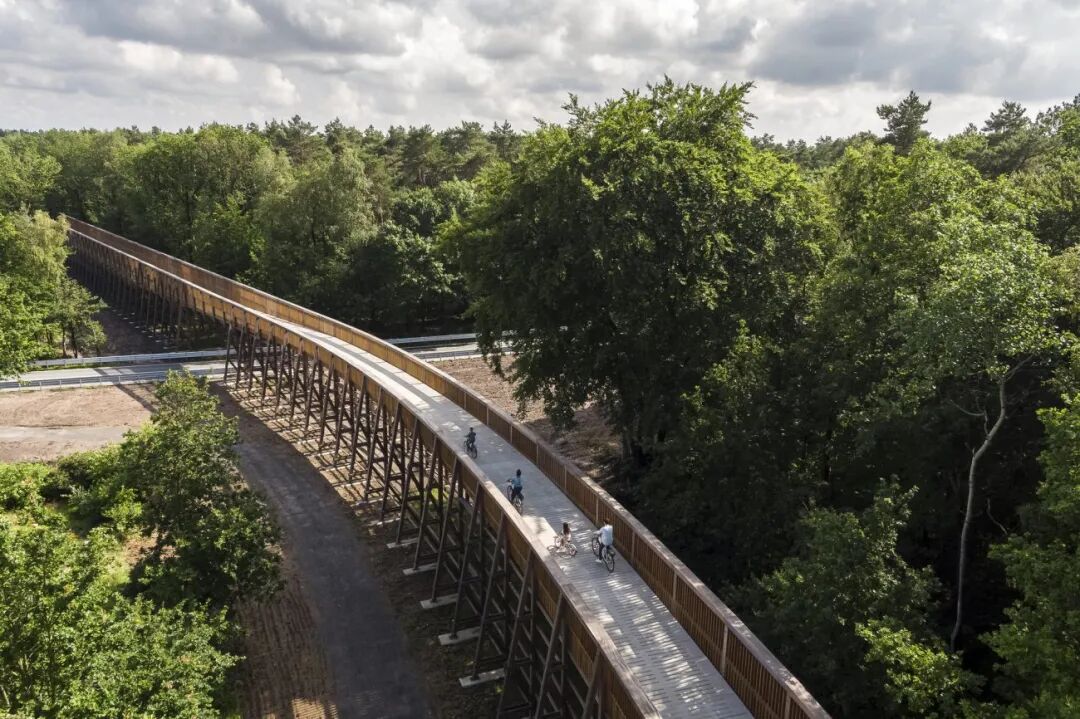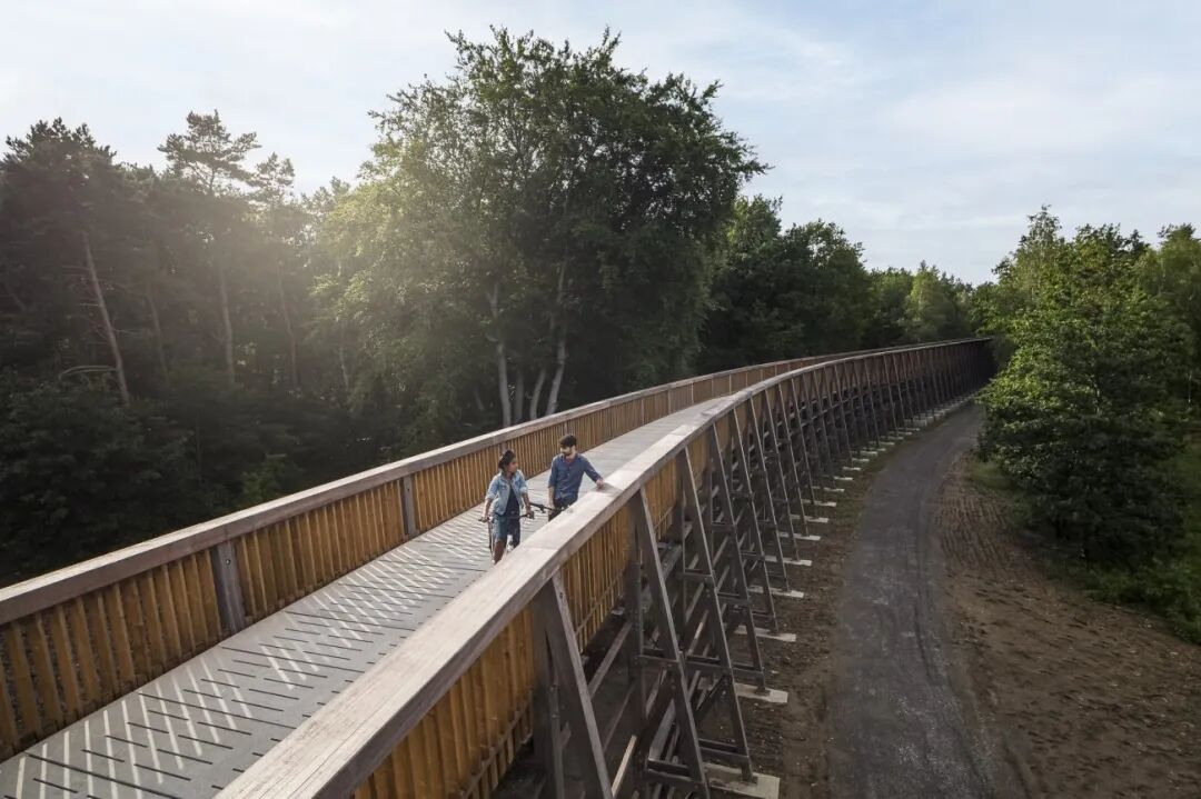 The bicycle bridge is part of 'Cycling through the Heathland’, a cycling experience route right through the Hoge Kempen National Park. In addition to a safe intersection with the road, the concept, integration and architecture of the bridge focuses on the experience of its users, on the bridge as an object in the landscape and on the ecological sensitivities of the area.The bridge design offers a unique view of the heathland and, with the high walls, builds a tension in the runup to it. Due to this changing experience, the bridge as a whole becomes an experience object.The bridge is also conceived as a tourist-recreational object on the border between the dense forest and the open heath. As a strong whole, it is an icon and landmark for the Hoge Kempen National Park, cycling tourism in Limburg and the mining past (through the use of local coniferous wood).