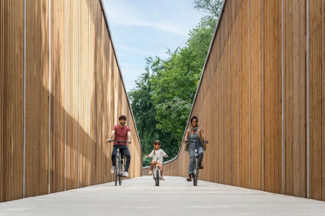 The support points that carry the bicycle deck each consist of two vertical wooden trusses that rest on concrete foundation soles. The trusses are conceived as standardized elements that can be produced in series. This benefits the progress of the works and reduces the multitude of constructive knots. The walls of the bicycle scaffolding are made of coniferous wood. The material refers to the mining wood used in the underground passages of the coal mines. As such the bicycle bridge has a link with the environment in which it stands: a cultural-historical landscape in which coniferous wood was planted en masse to meet the demand for mining wood.The construction method of the bridge focuses on rhythm, small spans and prefab elements. This enhances the image but also the coordination with the surrounding landscape. Thanks to the cost-effectiveness of the construction, the entire approach ramps are designed as a bridge. The bridge is thus not a physical barrier and does not hinder the migration of animals.The deck of the bicycle scaffolding made of concrete floor grids with a width of 3.5 meters is placed between the walls. With the choice of concrete, we are focusing on cycling comfort: the material provides the necessary grip in slippery conditions and ensures a flat road surface with the right rolling resistance and skid resistance. In addition, it is a durable material that requires little to no maintenance. The deck is supported by the wooden structure, with the exception of the span over the Weg naar Zutendaal. Here, for the sake of stability, steel girders are used that are hidden from view as much as possible.