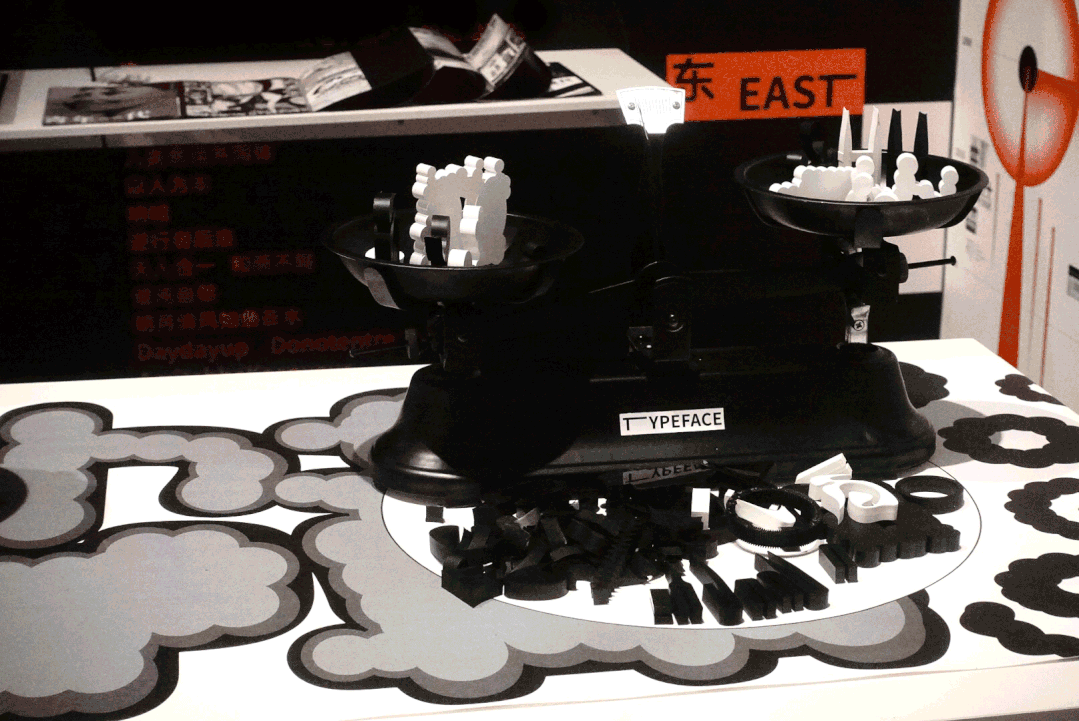 作品《字在东西》是一次视觉上的文字实验,东方与西方最重要的两大文字,即汉字与英文,是这场文字实验的主角。因文字系统的差异性造成的适配平衡问题是中西文碰撞与融合的产物,它们在实践中被要求拥有对两种语言与文化相互、相成、相生关系的敏感度。文字内容是我们生活影像的片段与情绪的截取。通过电子媒体与人机互动的形式,让两种文字的使用者参与到这场文字游戏中来。对中国哲学而言,真正重要的是各种力量的不断交融,融东西大家精粹为一体,熔现代人文和自然科学为一炉,用文字的平衡理论与实践体系,解读宇宙万物,诠释人间万象。