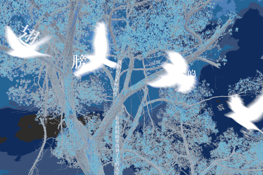 作品画面效果整体空灵诗意:将虚无缥缈的梦境感和潜意识世界的混沌感,真实与虚幻之间模糊的界限感通过视觉语言展现。作品整体色彩柔和氤氲,很符合虚幻之境的感觉,图形上采用飞鸟、梦蝶等象征自由的意向。表达出潜意识世界不羁自由的感觉。