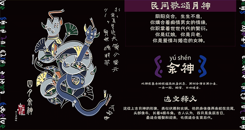 该学生作品是有关山海经古本图案中的十二月神形象的一个重构设计,以楚帛书原始形象为基础,重新勾勒十二月神形象,以全新的面貌呈现传统,注入新的视觉形象感受。从普罗大众的思绪延展,引出十二月神所代表的愿景。鸿蒙之始,山海无边,十二月神重构也犹如少年暝涬,涅槃重生。学生的作品以此提出一个观点,希望在疫情当下的时代,人们能保留对心中最纯净“地带”的关注。作品基于对传统形象的研究,赋予时代感;图形优美、装饰性强、主题鲜明、新颖独特。