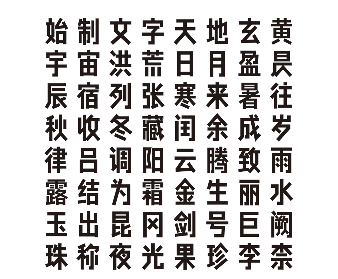 简单是一种美德,作品将汉字结构和笔画去繁化简,通过对几何化设计的深入研究,在识别度上挑战极限,整理出一套自己的汉字字体设计方法。作品运用完形心理学,借鉴草书笔画结构,省略汉字笔画、概括汉字字形,通过几何化的处理将汉字一步一步简化设计以增强汉字的视觉张力。将千字文重新演绎,呈现崭新的陌生感和趣味性的字体系统。通过汉字的形态与内在涵义相互融合,传达出汉字设计的独特魅力。以几何装饰的表现方式为观者提供全新的视觉体验,以简约设计风格抵抗信息烦杂的时代。