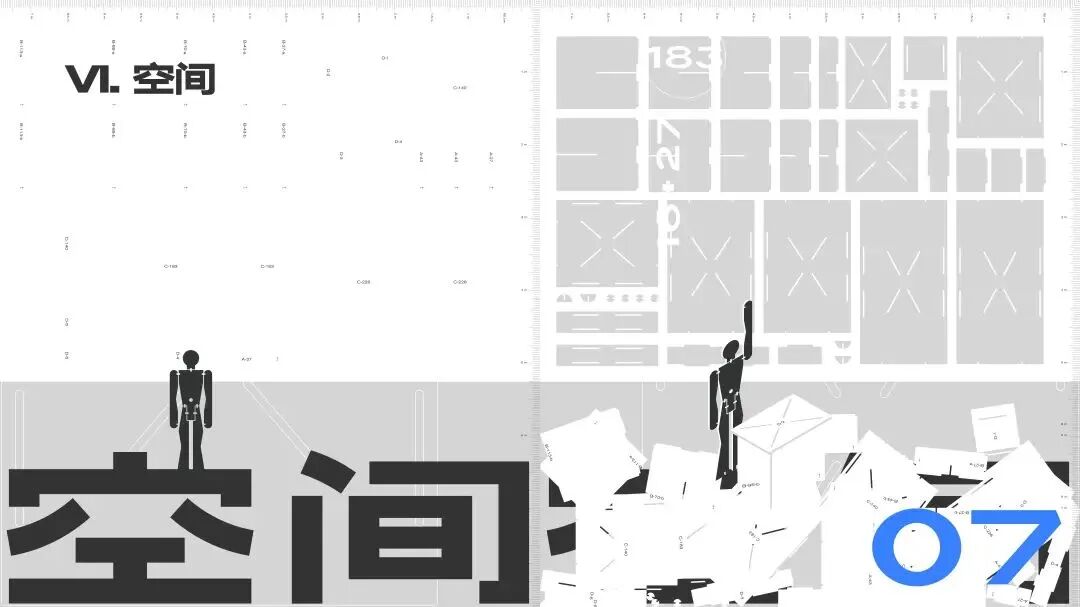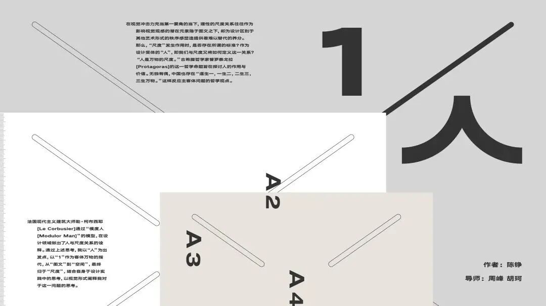 在视觉冲击力充当第一要角的当下,理性的尺度关系往往作为影响视觉观感的潜在元素隐于图文之下,却为设计区别于其他艺术形式的秩序感塑造提供着难以替代的养分。那么,“尺度”发生作用时,是否存在所谓的标准?作为设计受体的“人”,即我们与尺度又将如何定义这一关系?“人是万物的尺度。”古希腊哲学家普罗泰戈拉[Protagoras]的这一哲学命题旨在探讨人的作用与价值。无独有偶,中国也存在“道生一,一生二,二生三,三生万物。”这样反应主客体问题的哲学观点。法国现代主义建筑大师勒·柯布西耶[Le Corbusier]通过“模度人[Modulor Man]”的模型,在设计领域做出了人与尺度关系的诠释。通过上述思考,我以“人”为出发点,以“1”作为客体万物的指代,从“图文”到“空间”再归于“尺度”,结合自身于设计实践中的思考,以视觉形式阐释自己对于这一问题的思考。《1/人》这件作品既像一个“等式”的答案,也是问题本身。