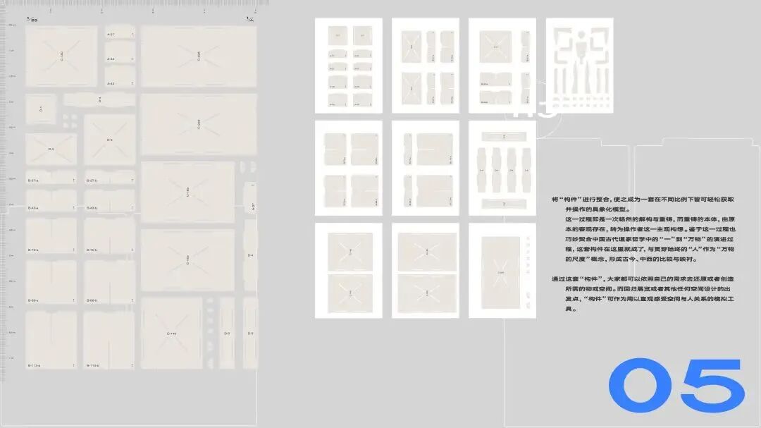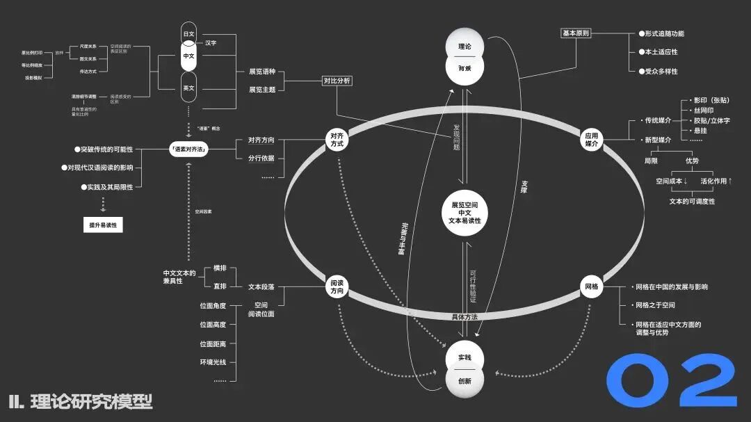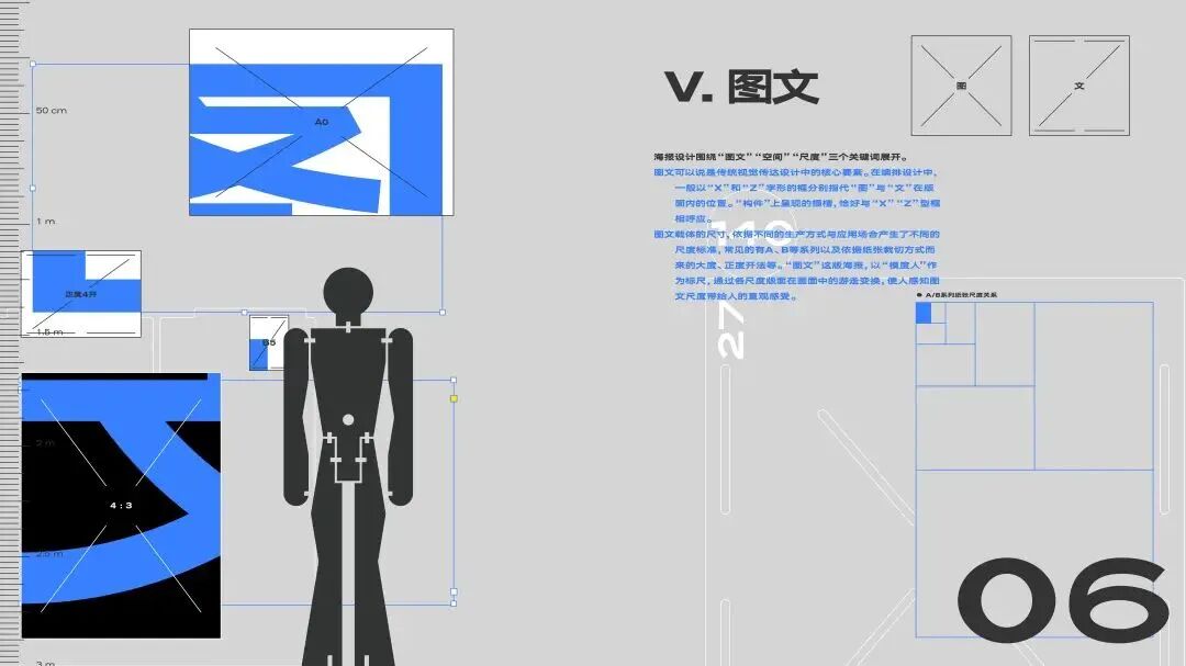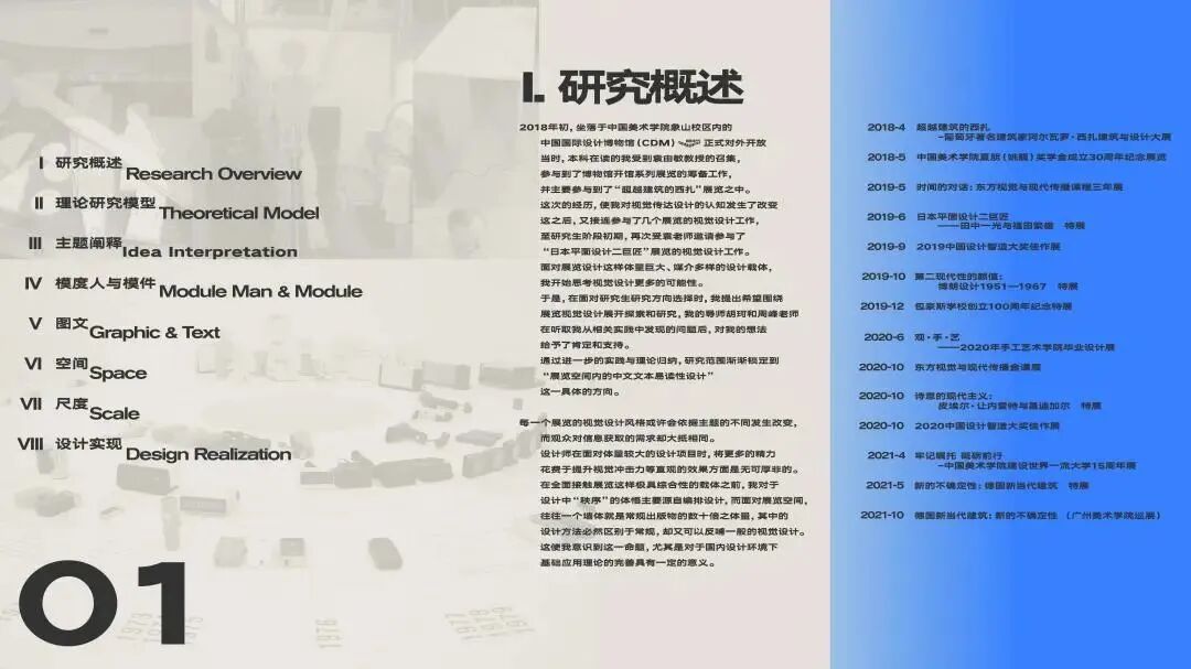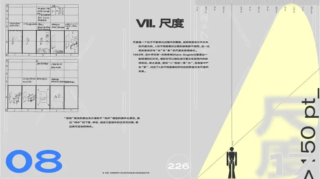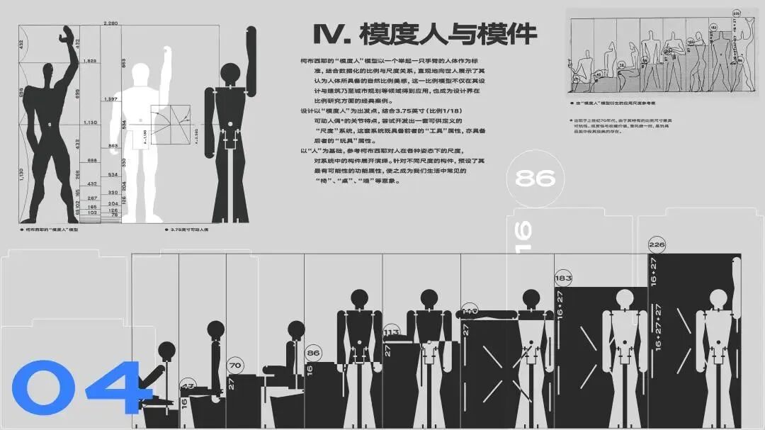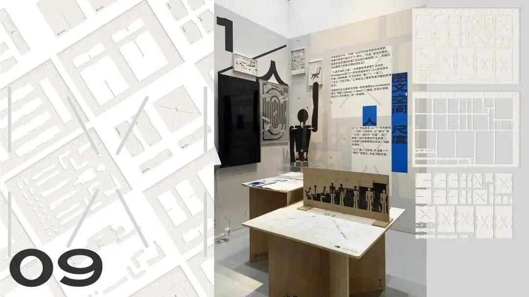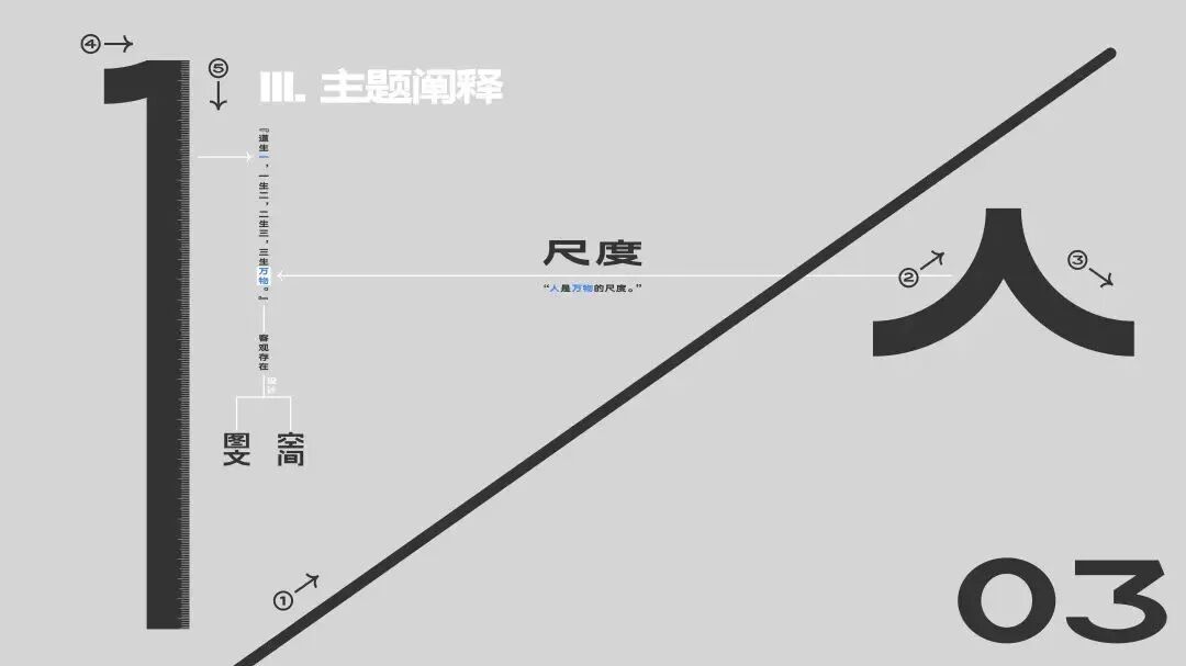设计以人为本,人是万物的尺度。作品通过跨学科跨领域的综合思考,结合自身大量展览设计实践中积累的经验,将图、文、物、空间、叙事等影响视觉观感的多种元素进行艺术形式的秩序归结,以人的视角和尺度为出发点,清晰整理出隐藏在空间叙事背后的视觉逻辑秩序。立足于展览空间中的文字设计与信息传达,重视人的立场与价值,从“人”到“图文”再到“空间”,终归于“尺度”比例关系。借鉴西方国际主义网格系统与人机工程学,探讨⽂本设计如何建立最佳阅读逻辑与视距来实现主题的高效信息传递。以人为最大公约数建立视觉尺度与标准关系,为中⽂语境下的展览设计贡献了有价值的思考。