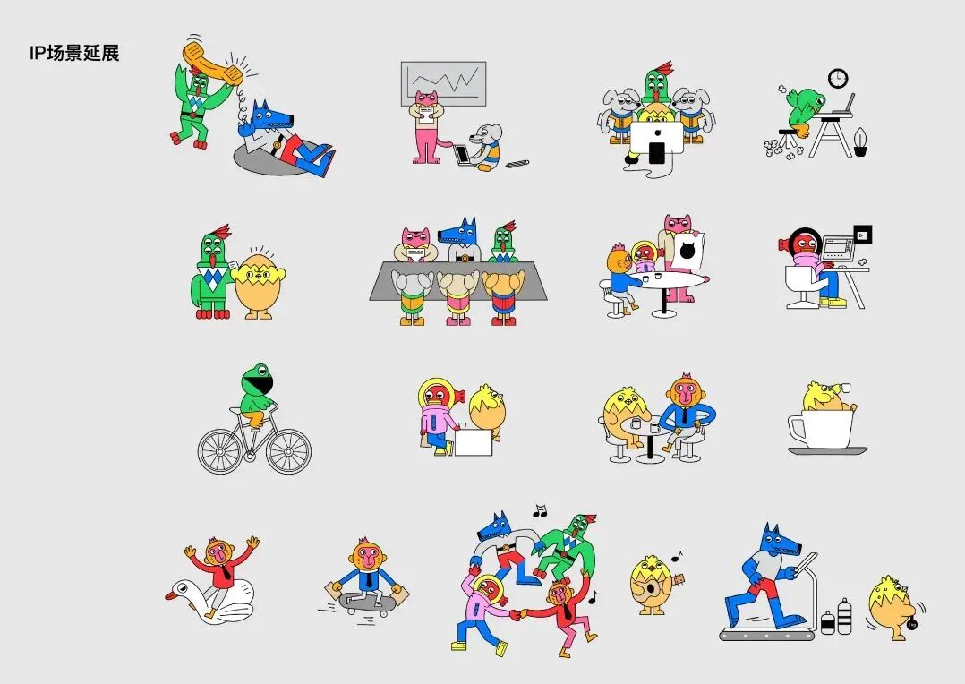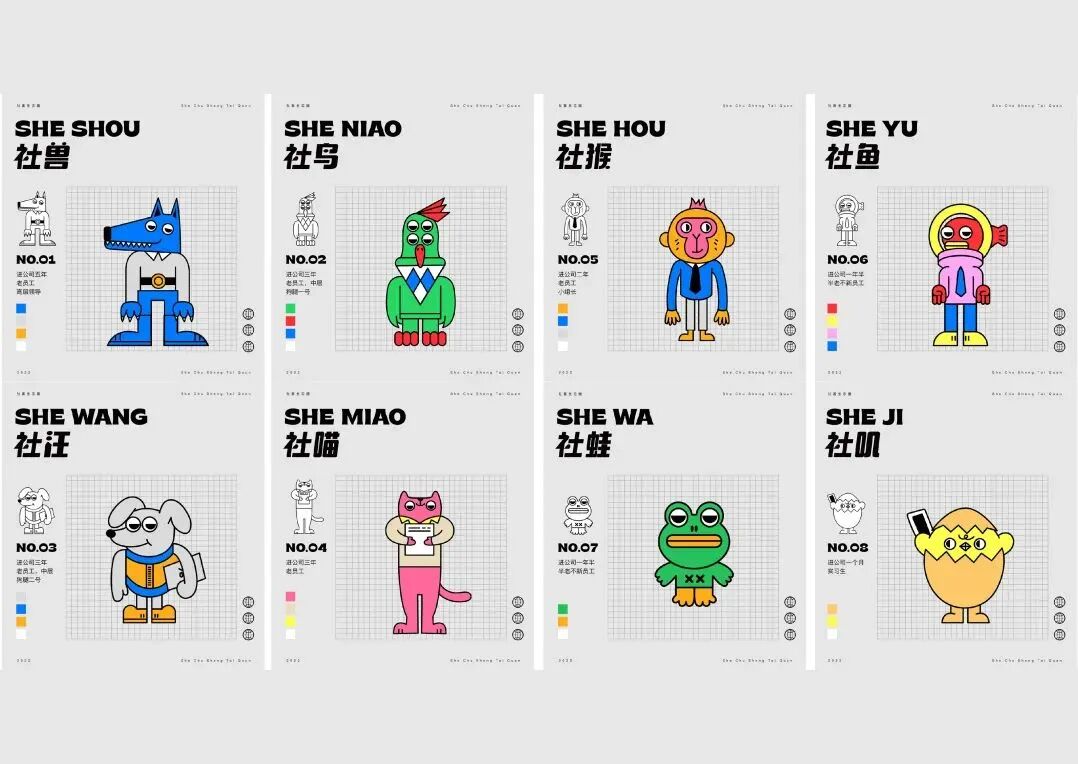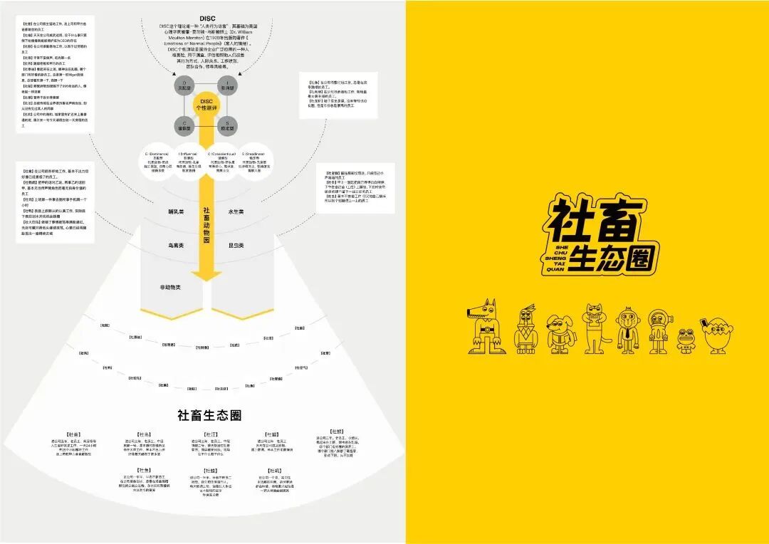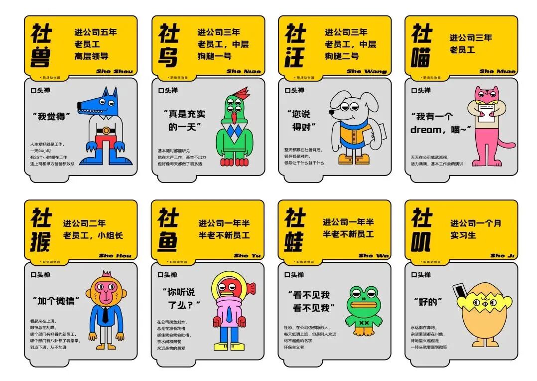 在高度紧张的工作环境中,“社畜文化”成为当代职场青年的一种话语策略,它代表着当代青年认清现实后的退缩式反抗。人们开始乐于从“社畜”和打工人这样的词语上建立身份认同,“社畜”现象便成为社会共鸣。作品以“社畜生态圈”这一概念切入,基于DISC测评这一识别不同人才风格的理论,把“社畜”物种群体进行了细分,按性格、特长、习性等要素做划分,总结归纳为8种典型职场动物,以IP创作的手段从诙谐自嘲的角度探讨现代职场生活。“社畜”蕴含着年轻职场人对现实生活不满的抱怨、无力改变现状的无奈还有权衡利弊之后只好自嘲的可爱。