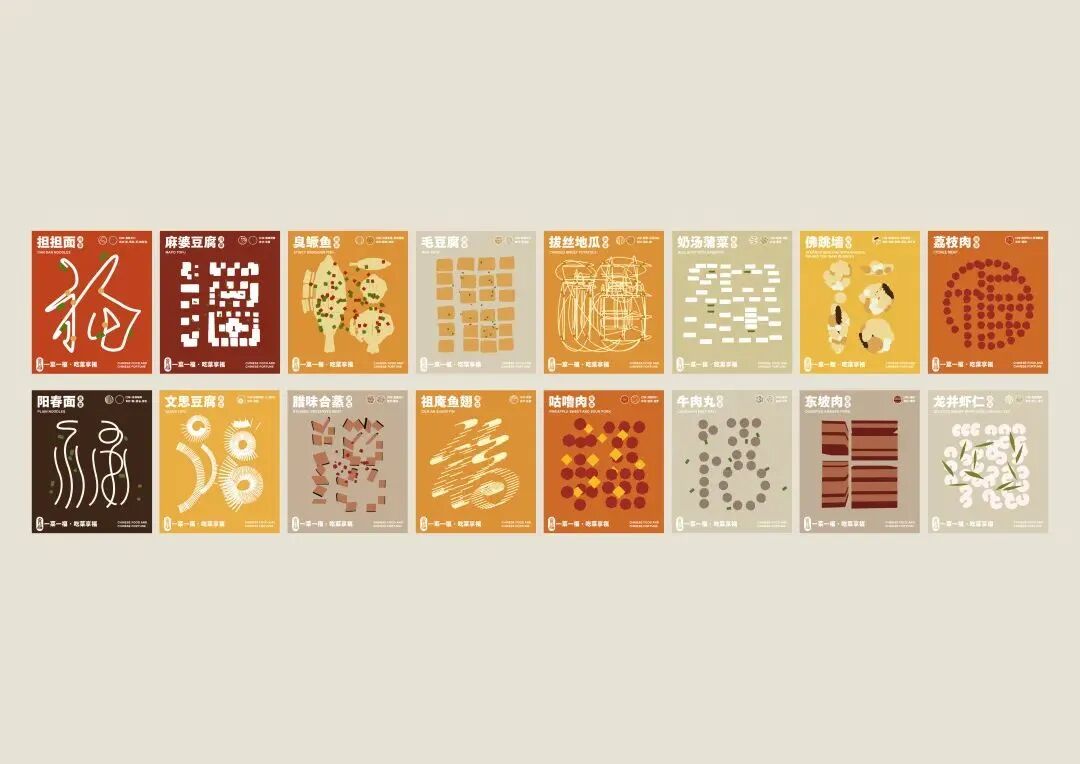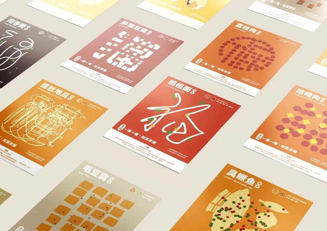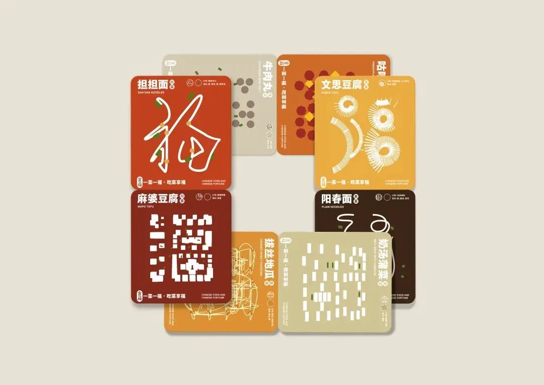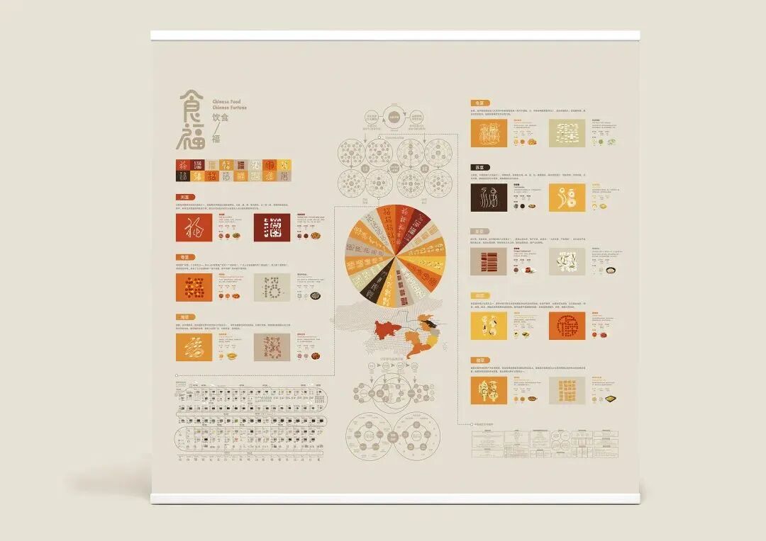 通过福文化与中国的饮食文化进行结合,汲取中国饮食文化中菜肴的部分与福字进行融合,选取中国的八大菜系作为载体,将不同的菜转化成福文字,并通过现代的几何动态语言来表达食物的制作过程、食物的呈现方式、食物的食用方式等。同时,通过一菜一福,吃菜享福的概念,让观者从生活中最息息相关的部分体会饮食文化和福文化。食福品牌不仅向大众普及了中国独特的饮食文化与福文化,也验证着汉字设计的作用性与传播性,通过动态的汉字结合几何化语言,展现了汉字设计结合文化主题的新形式表现,是对中国文化的现代化传播的探索,同时也是对于汉字设计的创新尝试。