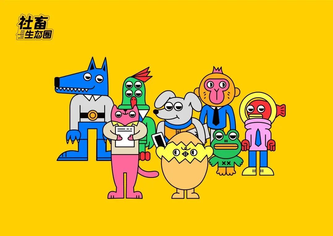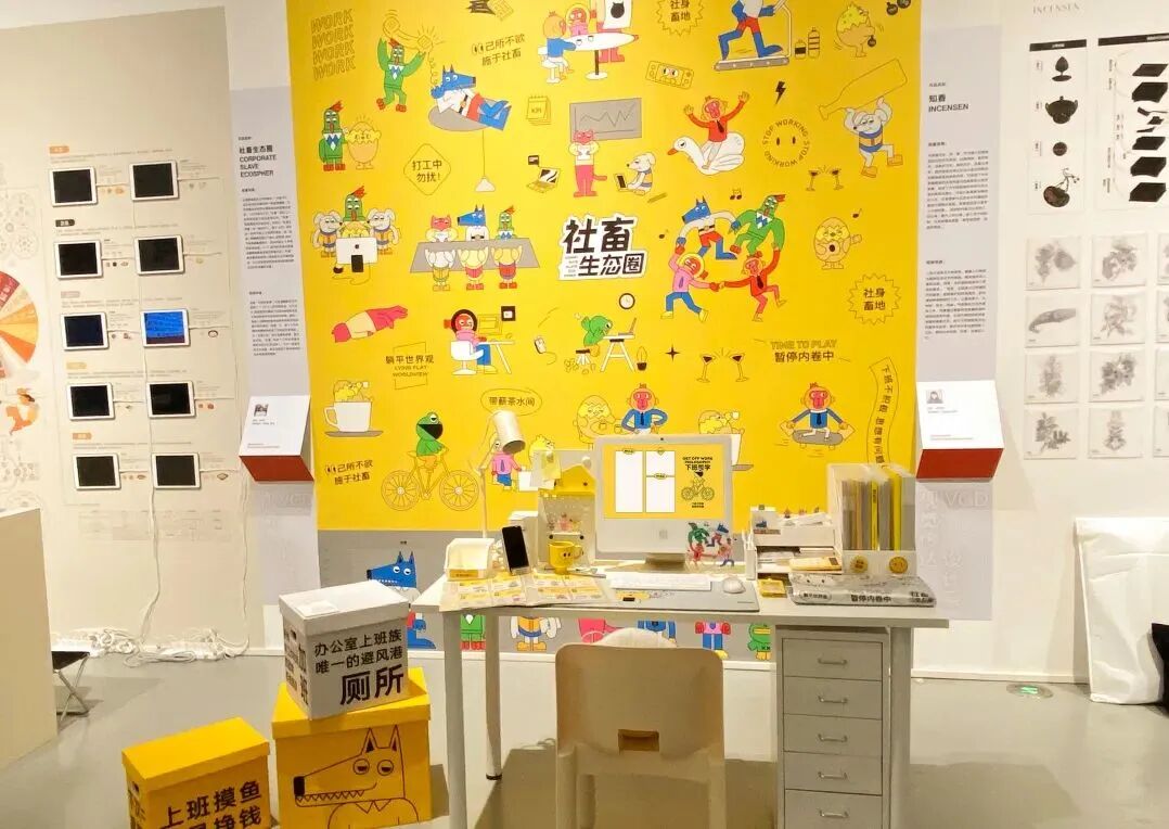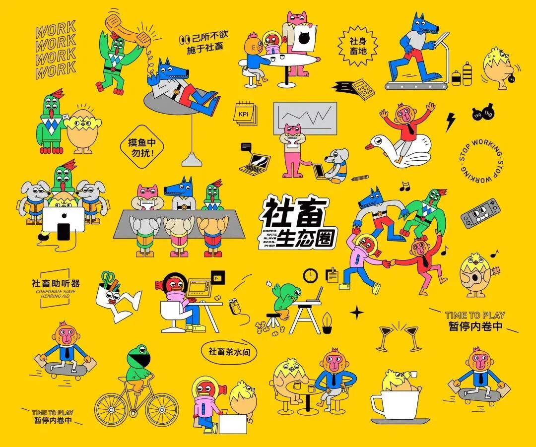 主题《社畜生态圈》以诙谐幽默的方式营造了一个打工人的生态环境,以文化IP的视觉形式描述了以生存和劳动关系为表征的青年社会性异化状态。通过一组拟人化动物的角色设定来体现互相依赖又相互制约“社畜”们,由于工作环境和性格特质形成了不同的社会等级。以“社畜文化”进行自嘲和反讽,因为她发现,“社畜”的这个工作状态确实挺符合自己以及同龄人。作为一种青年亚文化现象,其本质反映了青年群体的社会性表现和面貌。