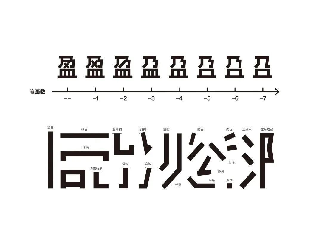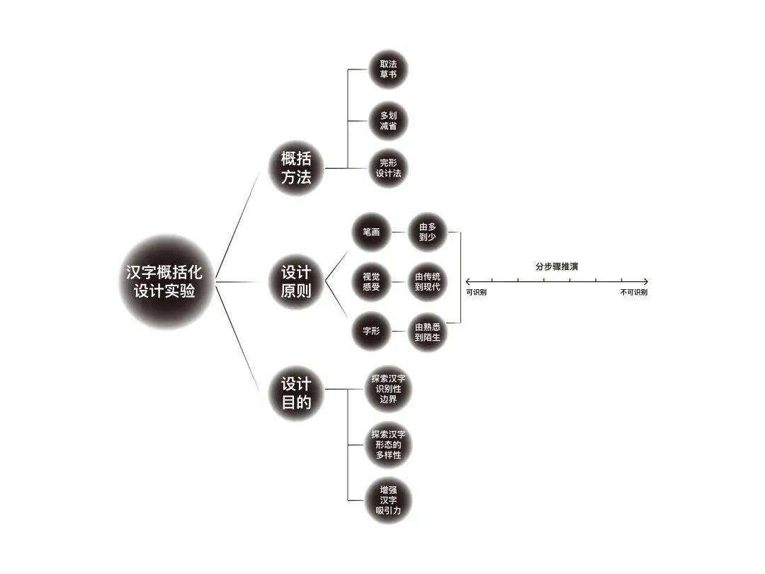 作品《始制文字》是一次汉字概括化的设计实验。作品采用借鉴草书的字形结构、完形设计法、多划减省这三种汉字概括方法,遵循汉字笔画由多到少、汉字视觉感受由传统到现代、汉字字形由熟悉到陌生的设计原则,将单个汉字的概括精简分为七个步骤推演呈现,每个步骤减少一个笔画结构。以实现探索汉字识别性边界、探索汉字形态的多样性、增强汉字视觉吸引力的设计目的。