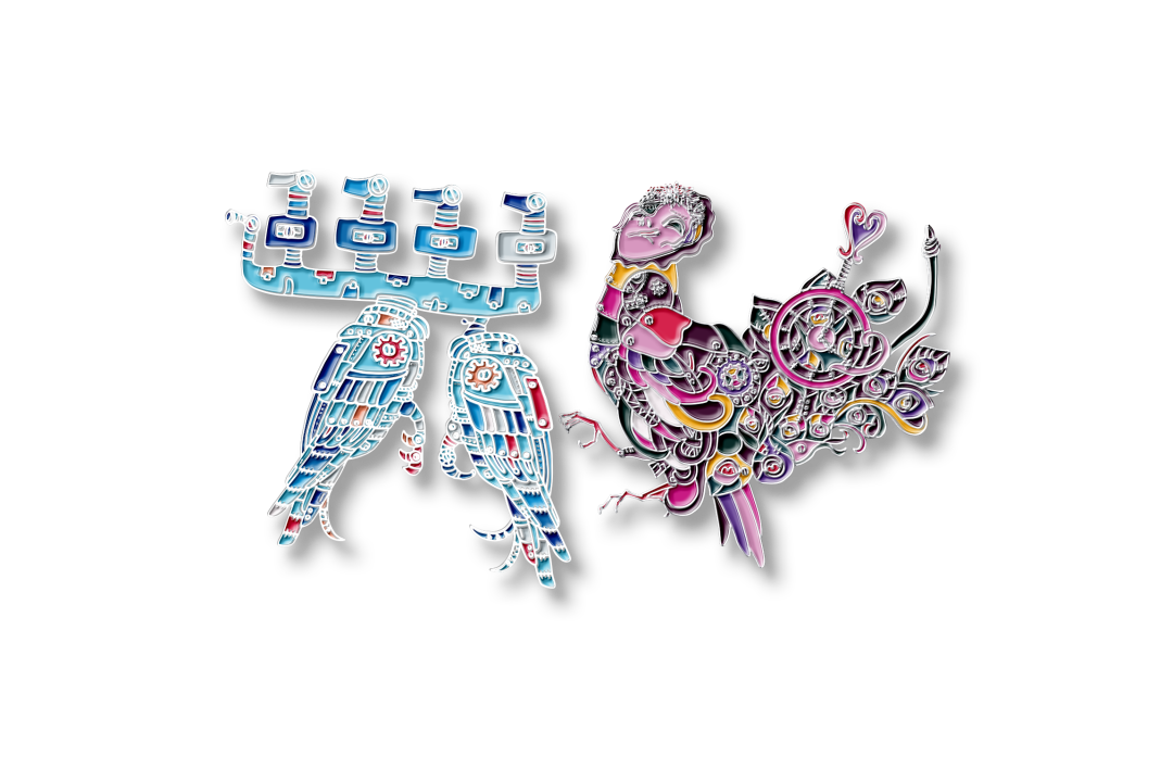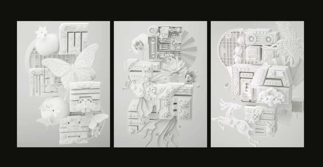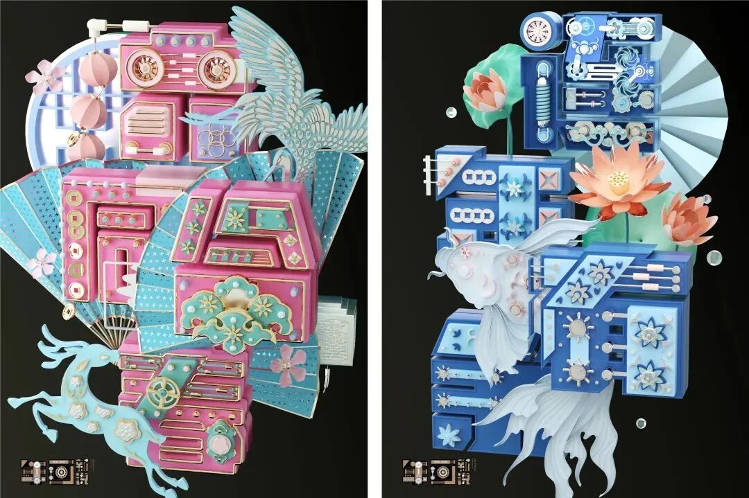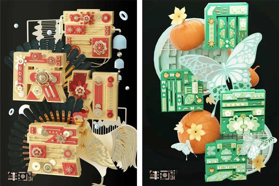 木板年画是中国传统工艺中非常独特并突出的一个门类,王烨欣同学自从研一开始研究木板年画的装饰元素和构成规律,从此开启了她的木板年画设计创新之路。《年画新说》主题借鉴了木板年画中的传统动植物绘画风格,提取了年画中带有谐音寓意的成语或词组,以一系列节庆特征的标题来突出年画主题。借助机械时代的蒸汽朋克画风,在传统元素的基础上注入现代的视觉表现语言,以三维立体的结构搭建文字细节,让传统年画具有新时代的机械美感,营造出一种超现实的装饰氛围,从而为传统题材注入了更多的趣味性和想象力。