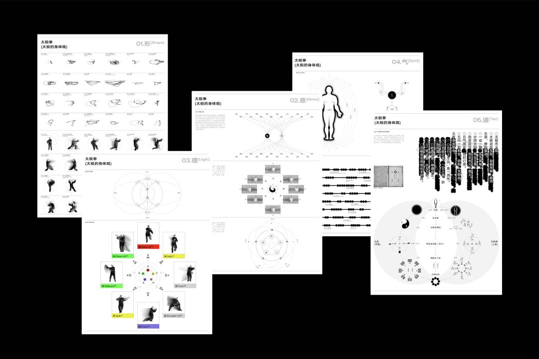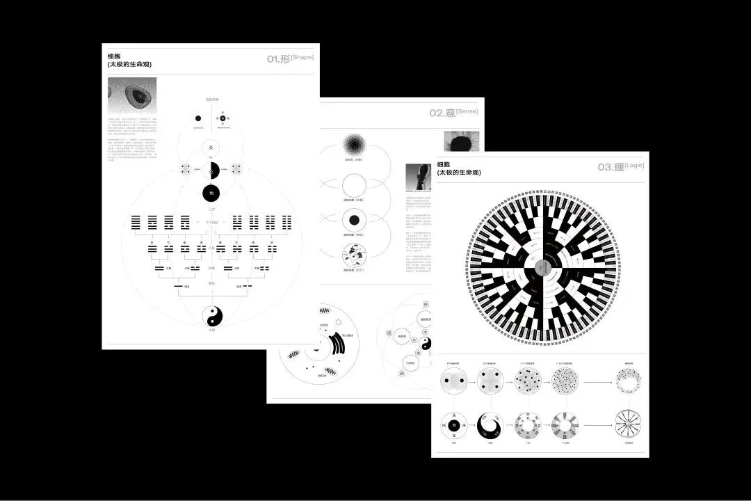 占志成同学读研期间一直对动态交互媒介非常感兴趣,并参与了一些交互实验性项目。毕业设计主题《太极动 万物生》通过梳理太极、八卦、五行之间的哲理关系,寻找太极图中隐藏的宇宙万物奥秘。希望通过捕捉太极的运动轨迹,呈现太极阴阳相互转化的运动现象,揭示宇宙万物时空循环往复的规律。最终希望通过一系列的视觉呈现及交互影像来表达和映证其研究观点:太极中所包含的抽象概念已超过了物理上的基础理论,而其动态轨迹演绎则更深刻地表达了从宇宙万物一切的生成,在设计领域展示着它持续而恒远的生命力。