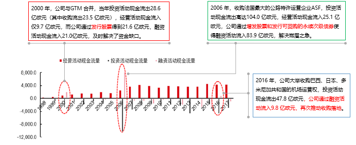 在通过特许经营业务获得高利润的同时,万喜注重控制项目投资与收益规模的动态平衡。新项目投资会带来未来收益,但也会增加短期资金负担。如图6所示,历史上,公司特许经营资本开支规模保持稳定。在2006年100%并购ASF之前,资本开支曾接近或超过OCF(OperatingCashFlow,经营现金流),但整体也保持了相对稳定的水平。通过把握项目的获取、投资、收益等各环节的收支平衡,公司特许经营现金流持续稳健增长。