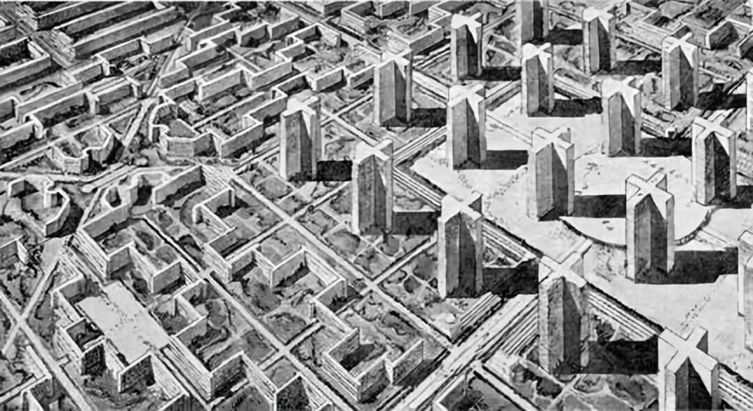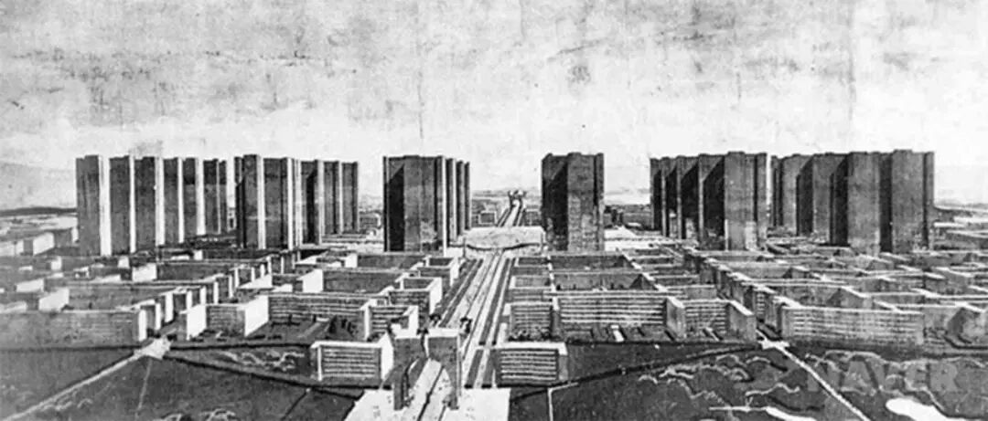 “激进的理论促成了对传统城镇概念的废除,采用了分散在苏联领土上的定居点计划,在路口设有公共餐饮、娱乐设施和就业中心,这让我们想到赖特的布罗德埃克城。