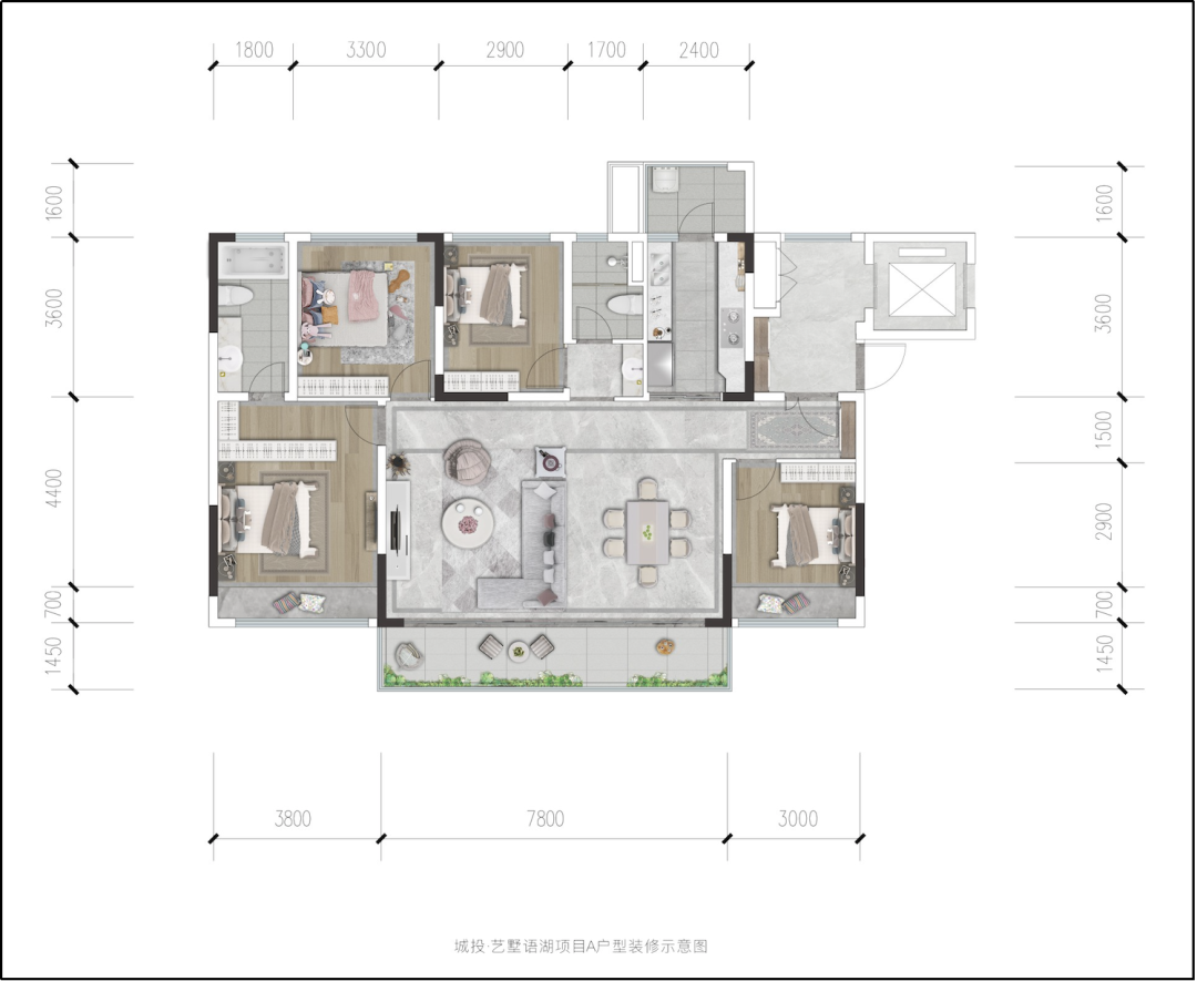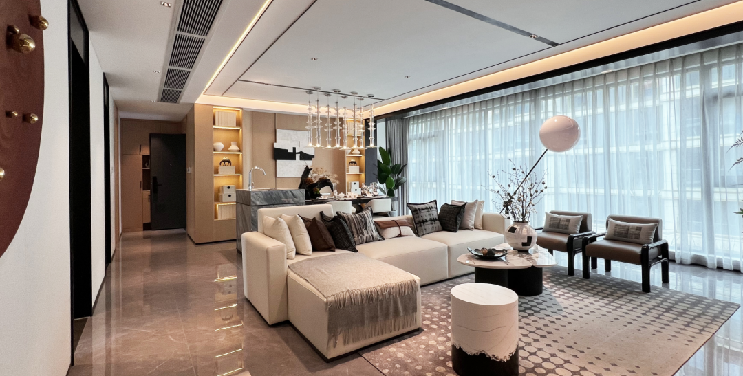 3. 产品力出众,144㎡做出180㎡即视感:打动客户买单的第一要素必然是产品,走进144㎡户型的实体样板间,你会恍惚以为走进了180㎡的大平层。整个横厅户型形成了一个将近50㎡的餐客厅区域,约7.8m长的超长阳台采光面极佳,远超140㎡左右产品7.2m的普遍标准,这样的空间感,只有市面上180㎡的产品才能给到。